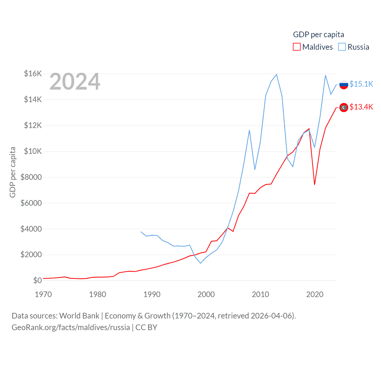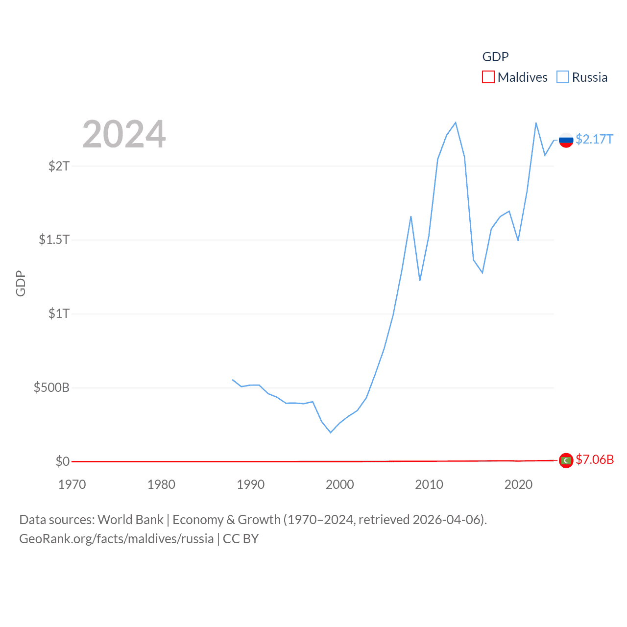 By GDP, Maldives ranks 159/197 ($7.06B) and Russia ranks 11/197 ($2.17T). By GDP per capita, Maldives ranks 75/197 ($13,379), while Russia ranks 68/197 ($15,145).