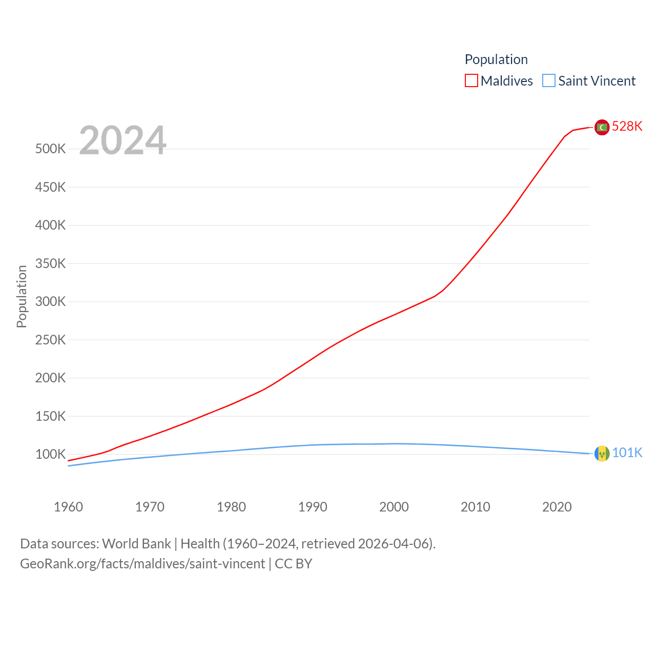 Maldives has a population of 528K (ranked 168/197), compared with 101K in Saint Vincent (ranked 184/197). Maldives' land area is 115.1 sq mi versus 150.6 sq mi for Saint Vincent (ranked 188th vs. 185th).