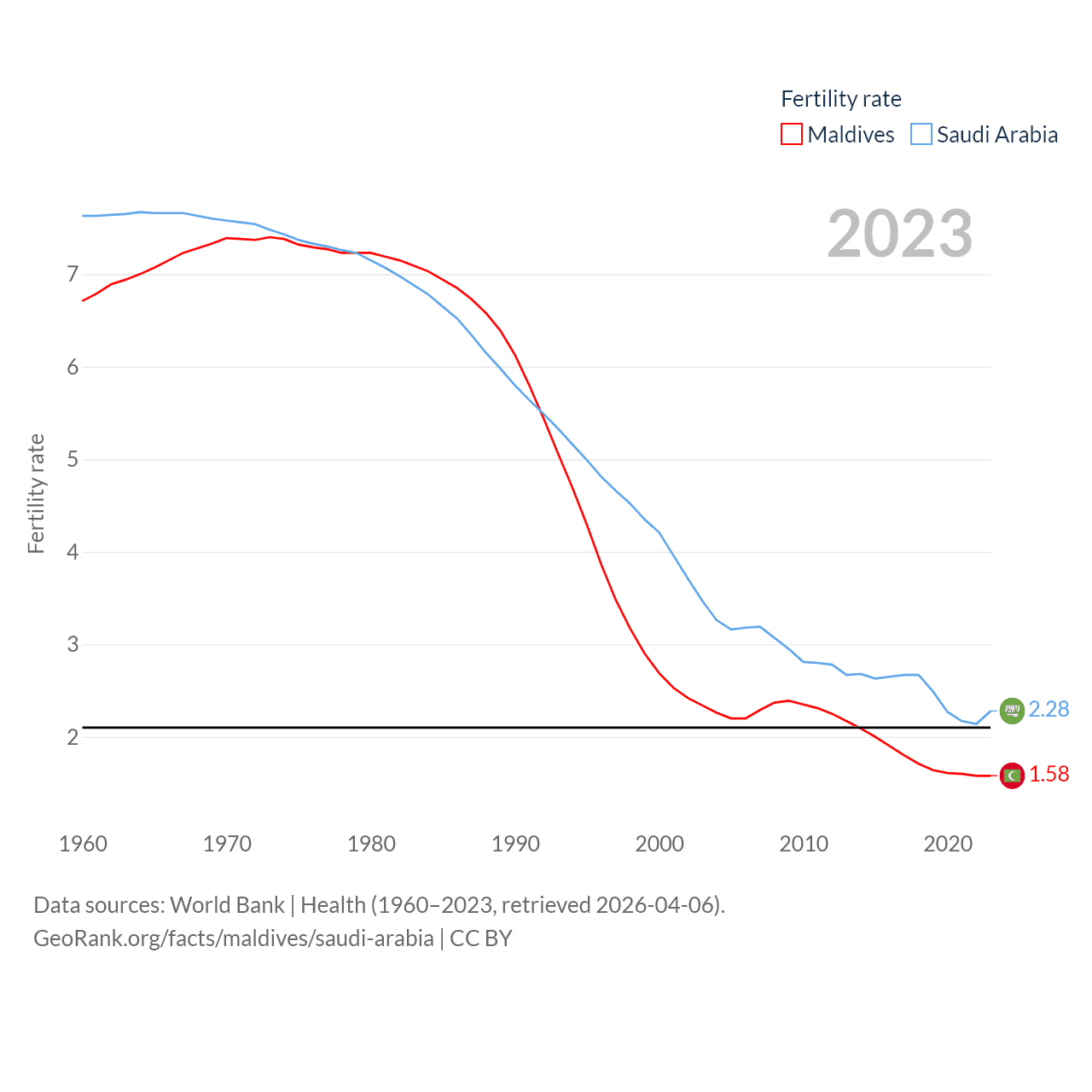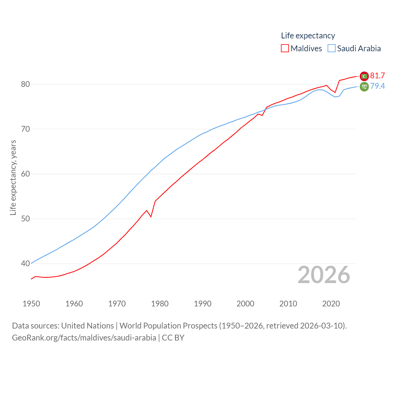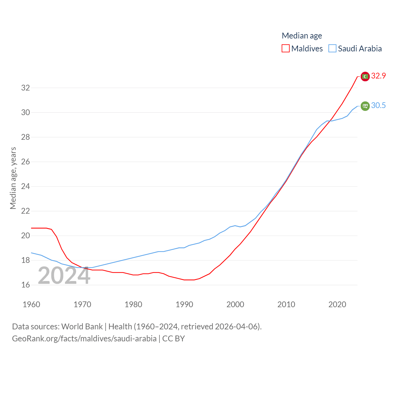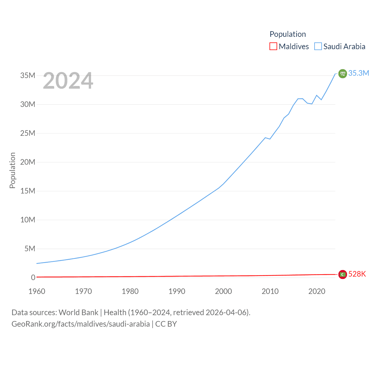 Maldives has a population of 528K (ranked 168/197), compared with 35.3M in Saudi Arabia (ranked 45/197). Maldives' land area is 115.1 sq mi versus 830,000 sq mi for Saudi Arabia (ranked 188th vs. 12th).