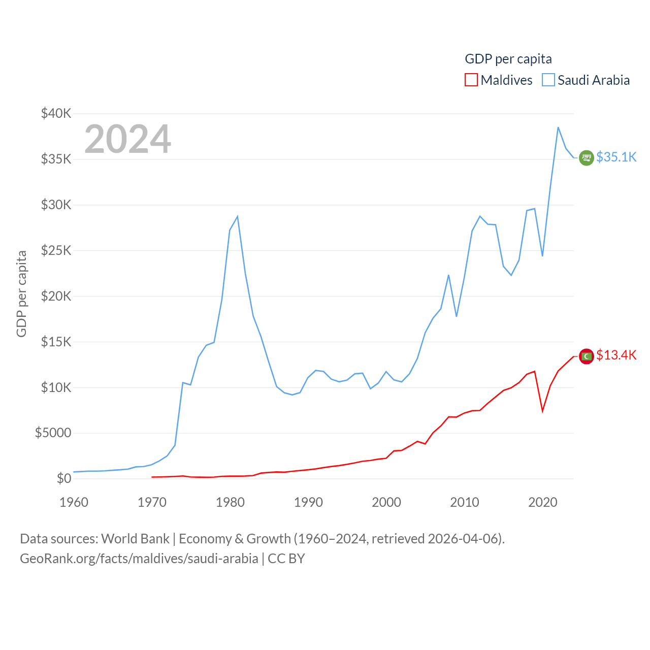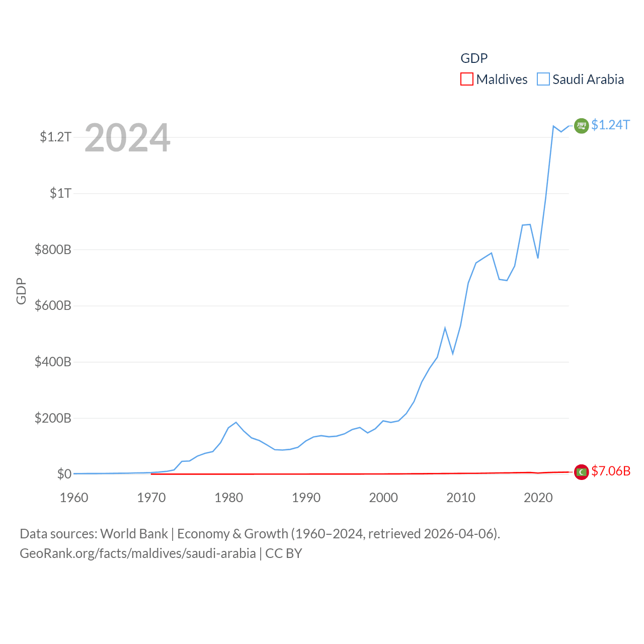 By GDP, Maldives ranks 159/197 ($7.06B) and Saudi Arabia ranks 18/197 ($1.24T). By GDP per capita, Maldives ranks 75/197 ($13,379), while Saudi Arabia ranks 33/197 ($35,122).