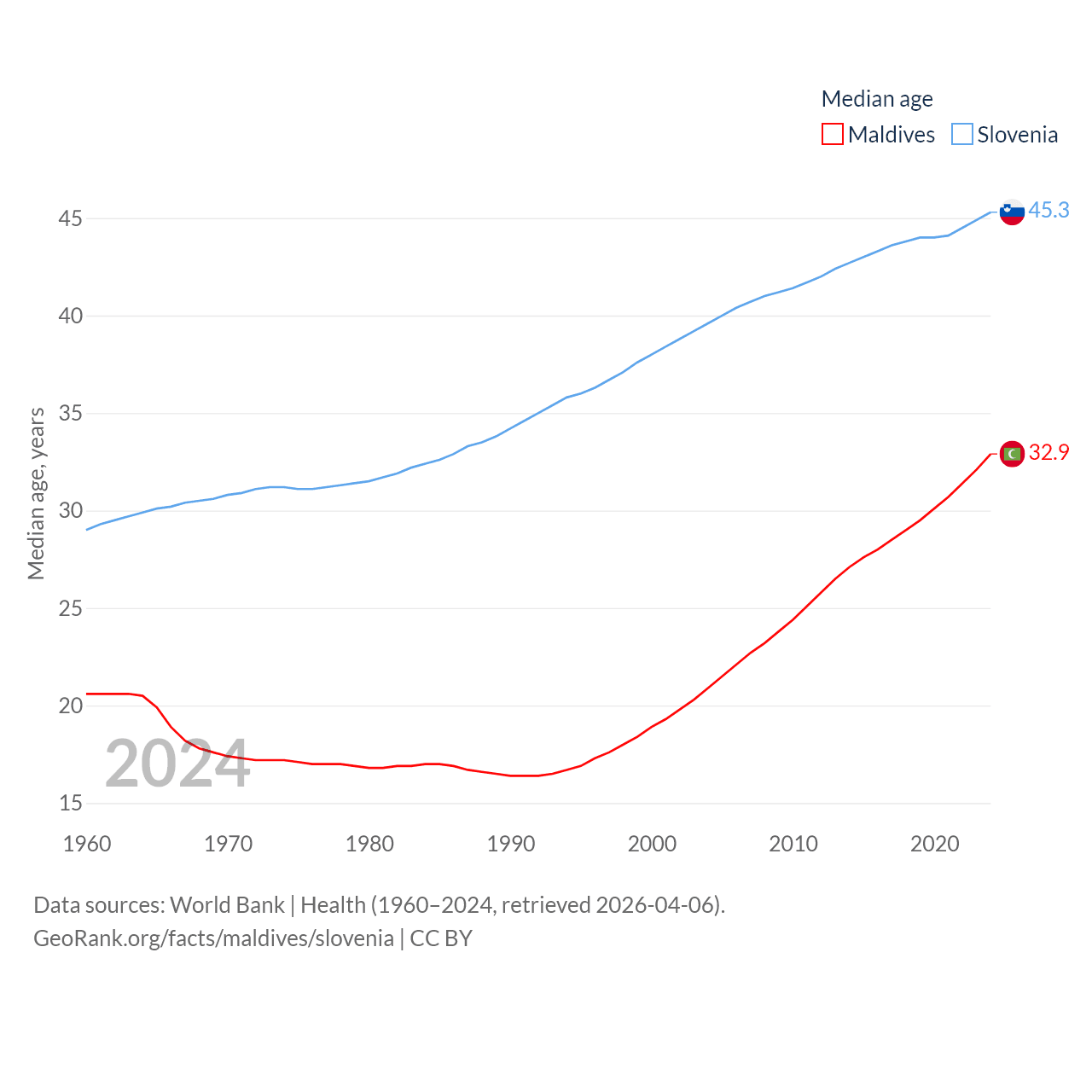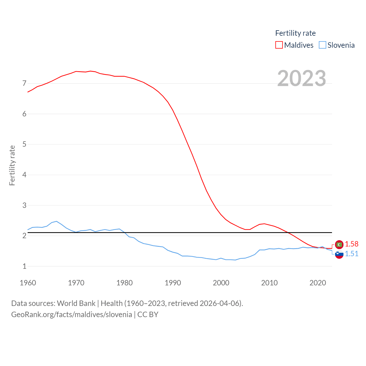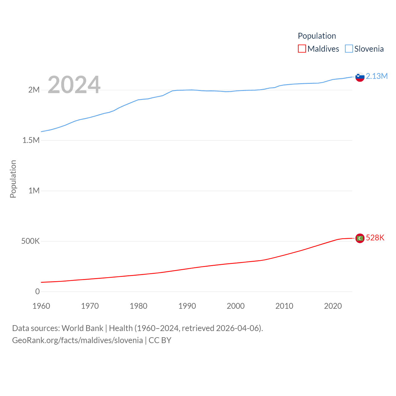 Maldives has a population of 528K (ranked 168/197), compared with 2.13M in Slovenia (ranked 147/197). Maldives' land area is 115.1 sq mi versus 7,774 sq mi for Slovenia (ranked 188th vs. 151st).