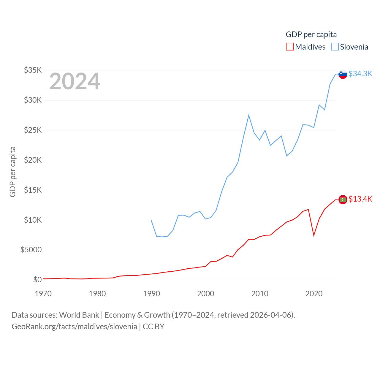 By GDP, Maldives ranks 159/197 ($7.06B) and Slovenia ranks 86/197 ($73B). By GDP per capita, Maldives ranks 75/197 ($13,379), while Slovenia ranks 34/197 ($34,301).