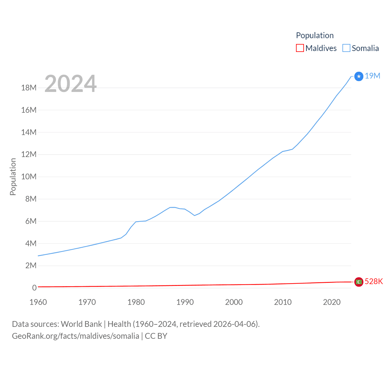 Maldives has a population of 528K (ranked 168/197), compared with 19M in Somalia (ranked 68/197). Maldives' land area is 115.1 sq mi versus 242,217 sq mi for Somalia (ranked 188th vs. 42nd).