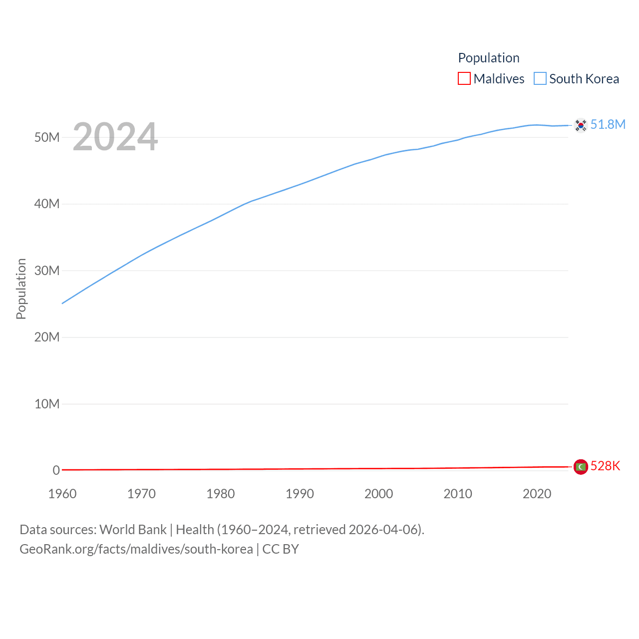 Maldives has a population of 528K (ranked 168/197), compared with 51.8M in South Korea (ranked 29/197). Maldives' land area is 115.1 sq mi versus 37,684 sq mi for South Korea (ranked 188th vs. 105th).
