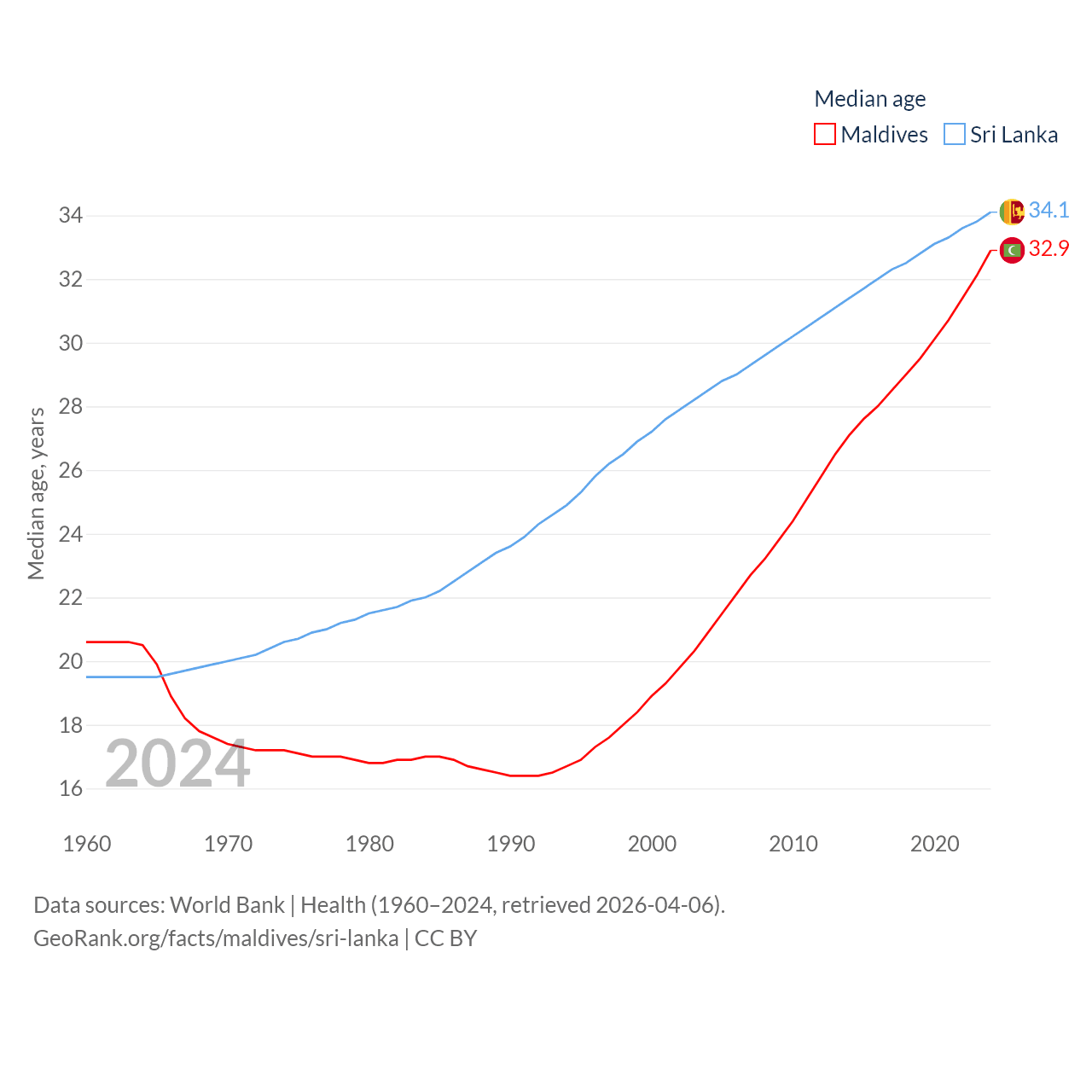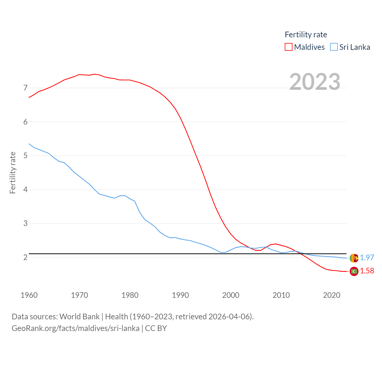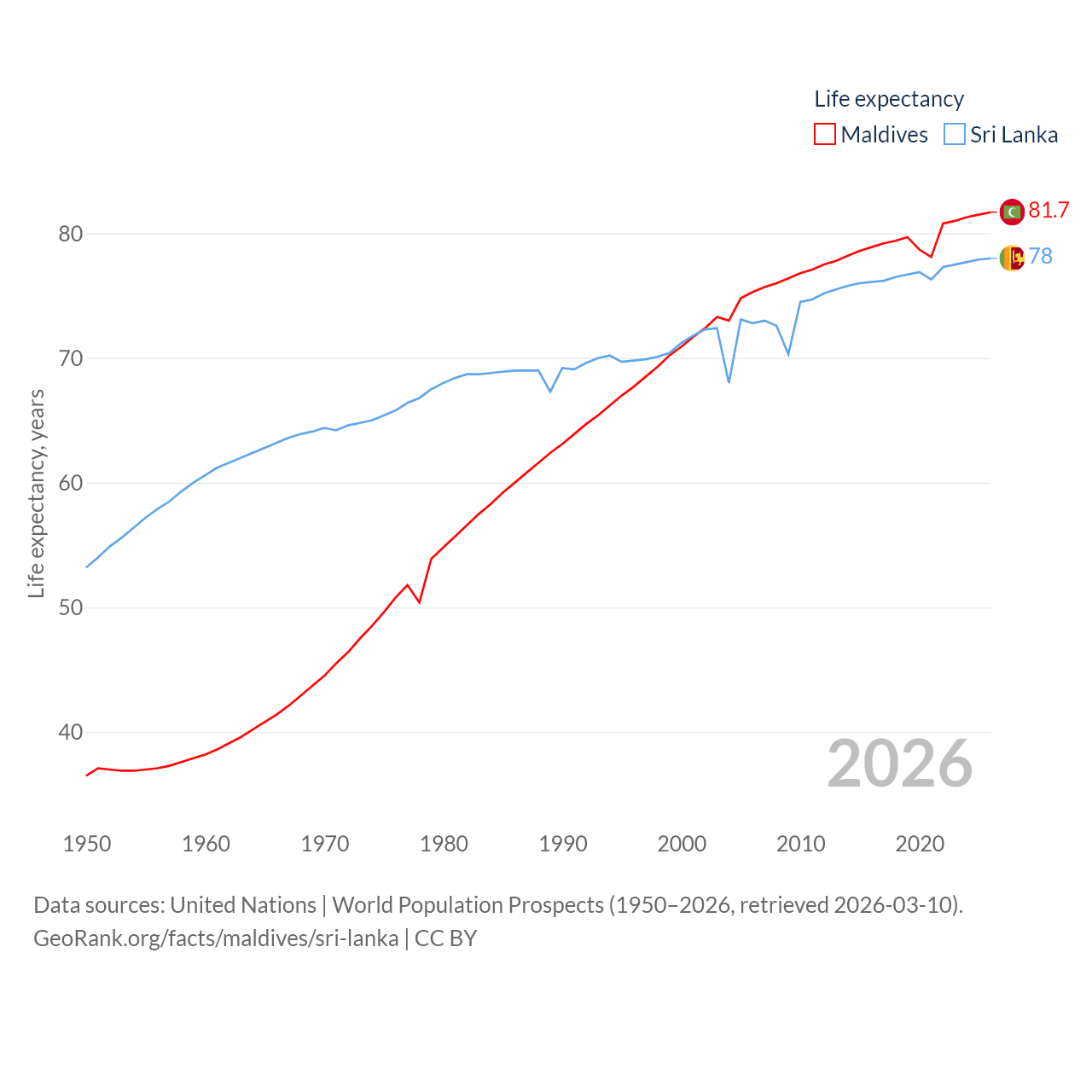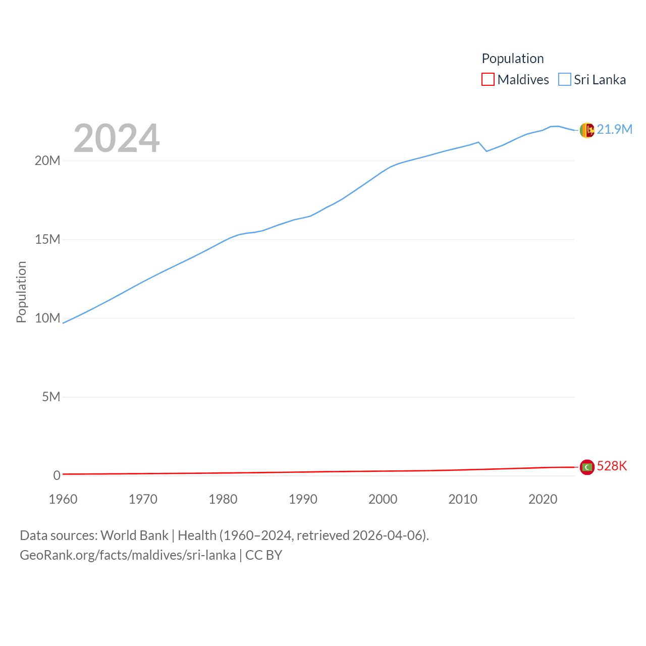 Maldives has a population of 528K (ranked 168/197), compared with 21.9M in Sri Lanka (ranked 61/197). Maldives' land area is 115.1 sq mi versus 23,884 sq mi for Sri Lanka (ranked 188th vs. 122nd).
