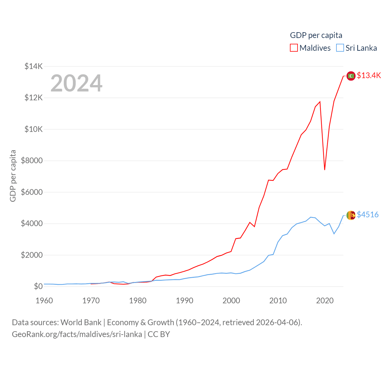 By GDP, Maldives ranks 159/197 ($7.06B) and Sri Lanka ranks 72/197 ($99B). By GDP per capita, Maldives ranks 75/197 ($13,379), while Sri Lanka ranks 124/197 ($4,516).