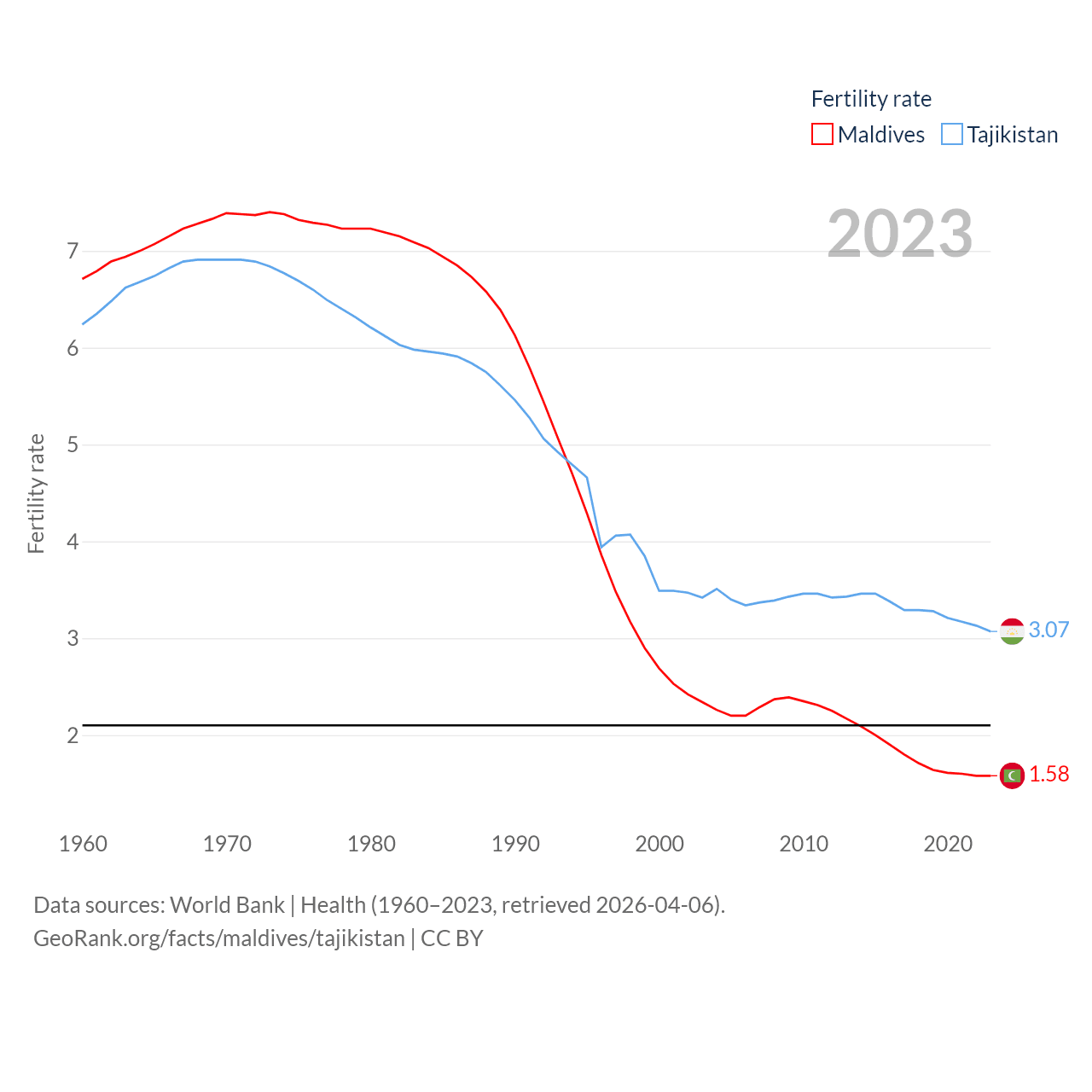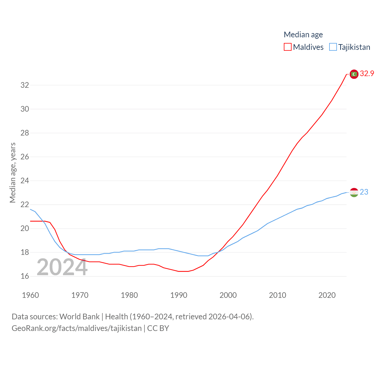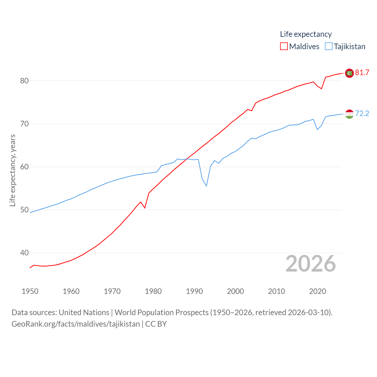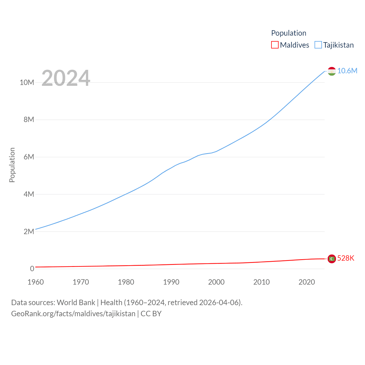 Maldives has a population of 528K (ranked 168/197), compared with 10.6M in Tajikistan (ranked 91/197). Maldives' land area is 115.1 sq mi versus 53,587 sq mi for Tajikistan (ranked 188th vs. 93rd).