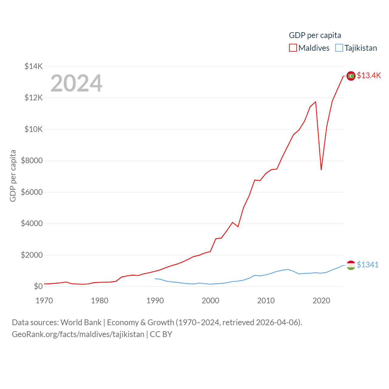 By GDP, Maldives ranks 159/197 ($7.06B) and Tajikistan ranks 145/197 ($14.2B). By GDP per capita, Maldives ranks 75/197 ($13,379), while Tajikistan ranks 166/197 ($1,341).