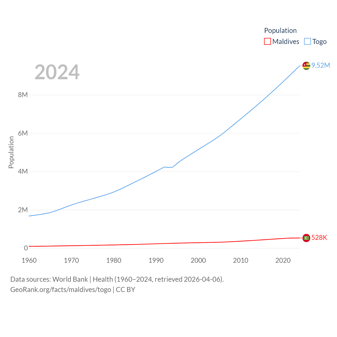 Maldives has a population of 528K (ranked 168/197), compared with 9.52M in Togo (ranked 98/197). Maldives' land area is 115.1 sq mi versus 21,000 sq mi for Togo (ranked 188th vs. 124th).