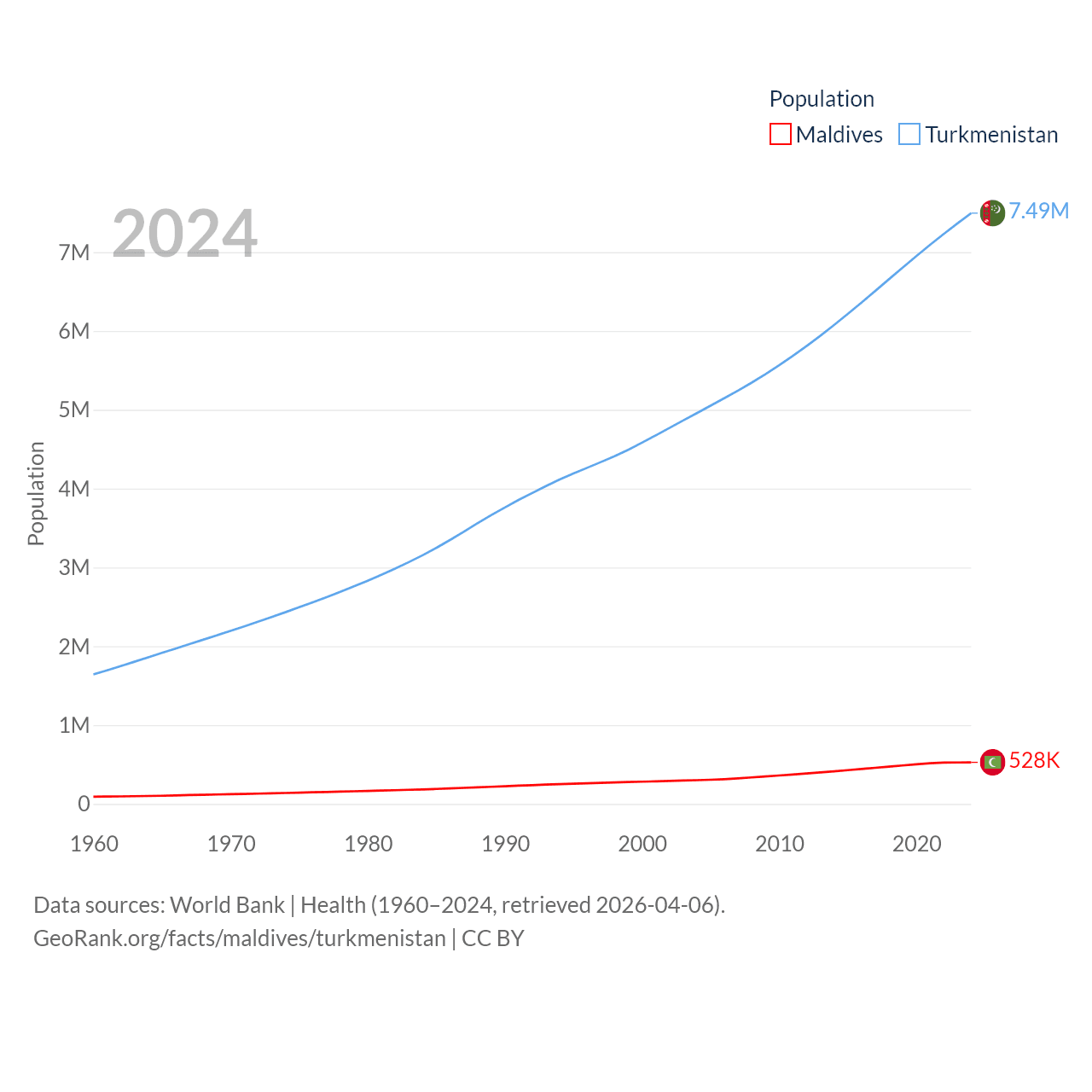 Maldives has a population of 528K (ranked 168/197), compared with 7.49M in Turkmenistan (ranked 104/197). Maldives' land area is 115.1 sq mi versus 181,441 sq mi for Turkmenistan (ranked 188th vs. 53rd).
