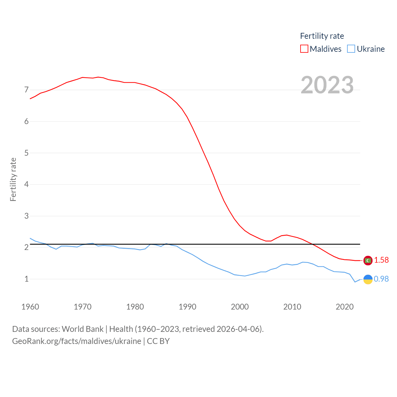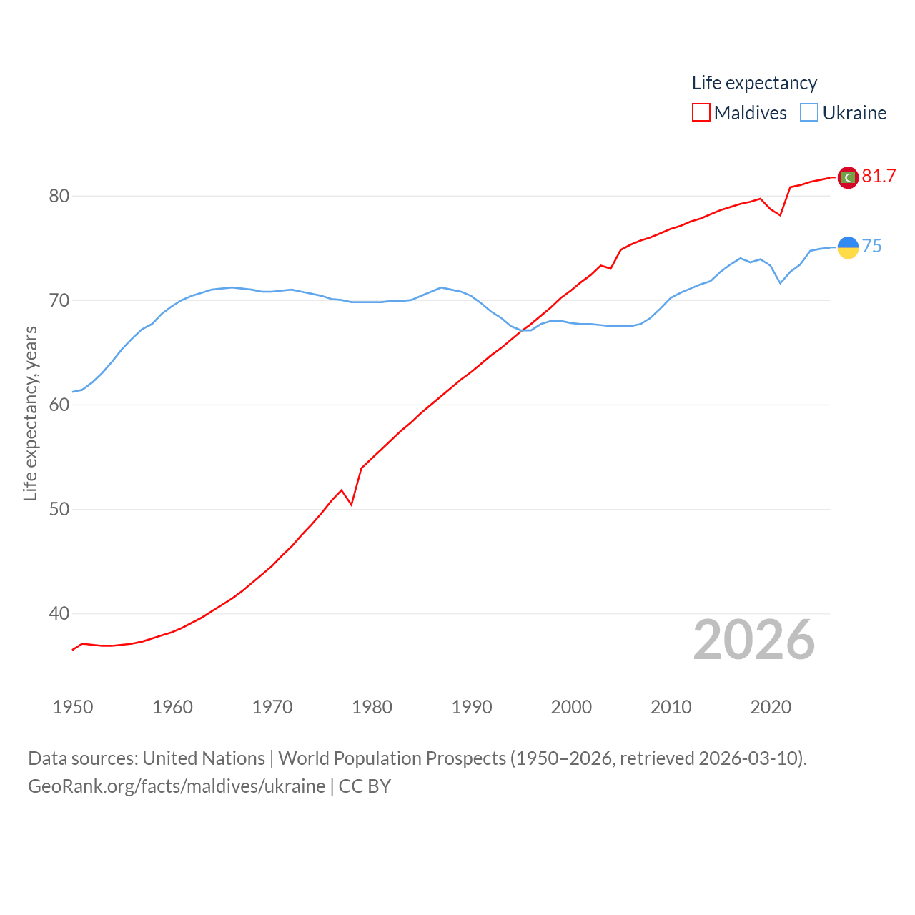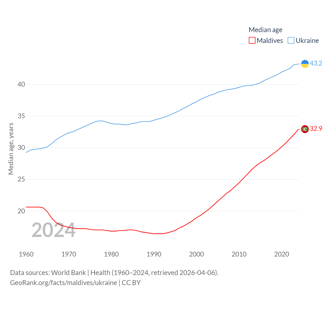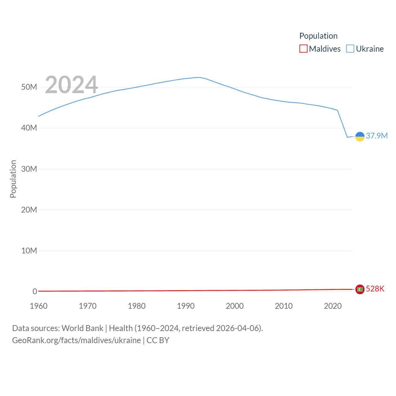 Maldives has a population of 528K (ranked 168/197), compared with 37.9M in Ukraine (ranked 41/197). Maldives' land area is 115.1 sq mi versus 223,708 sq mi for Ukraine (ranked 188th vs. 46th).