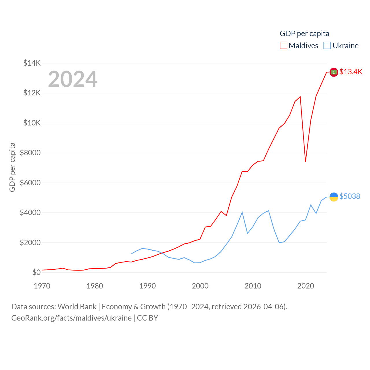 By GDP, Maldives ranks 159/197 ($7.06B) and Ukraine ranks 57/197 ($191B). By GDP per capita, Maldives ranks 75/197 ($13,379), while Ukraine ranks 120/197 ($5,038).