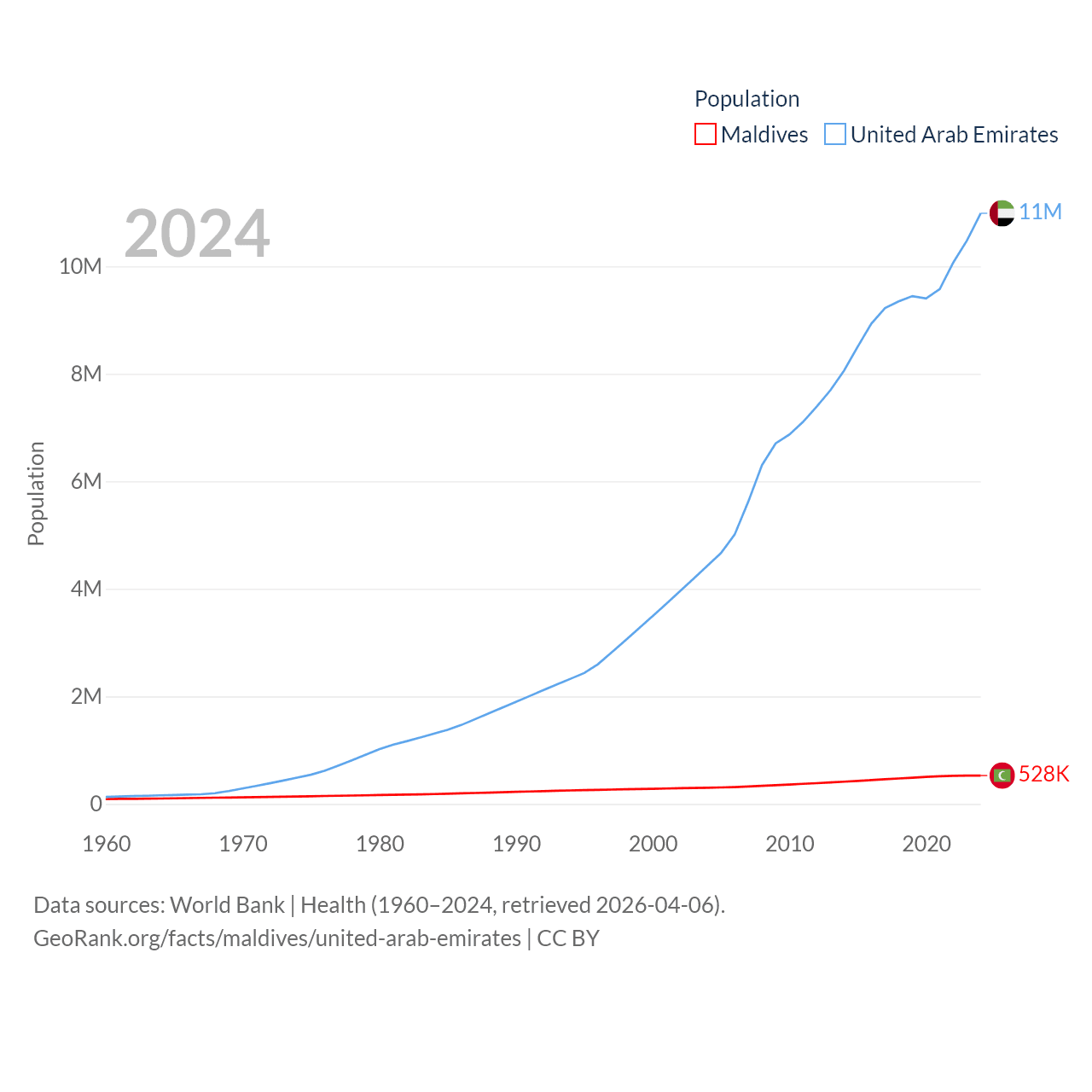 Maldives has a population of 528K (ranked 168/197), compared with 11M in The United Arab Emirates (ranked 86/197). Maldives' land area is 115.1 sq mi versus 27,421 sq mi for The United Arab Emirates (ranked 188th vs. 117th).