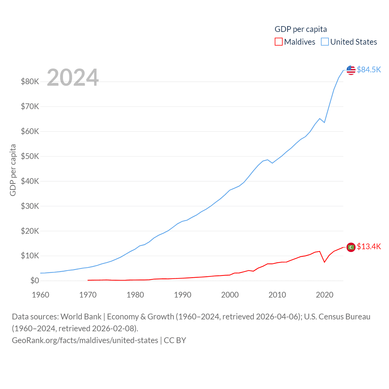 By GDP, Maldives ranks 159/197 ($7.06B) and The United States ranks 1/197 ($28.8T). By GDP per capita, Maldives ranks 75/197 ($13,379), while The United States ranks 10/197 ($84,534).