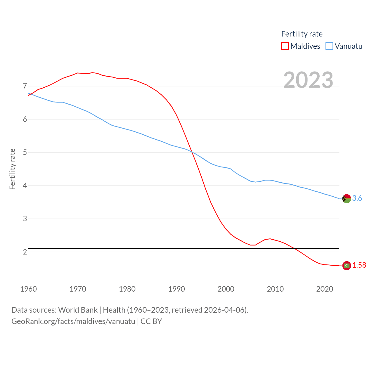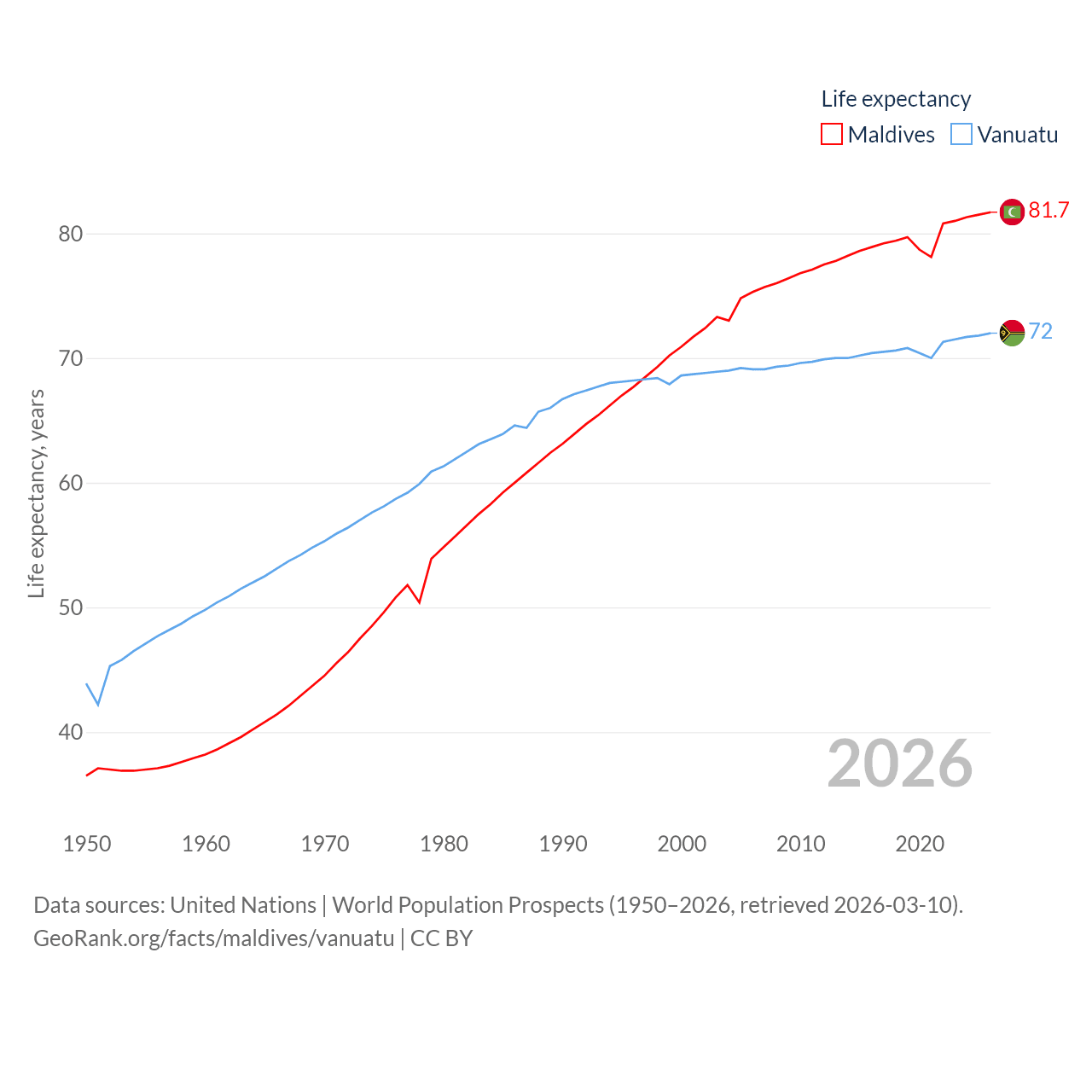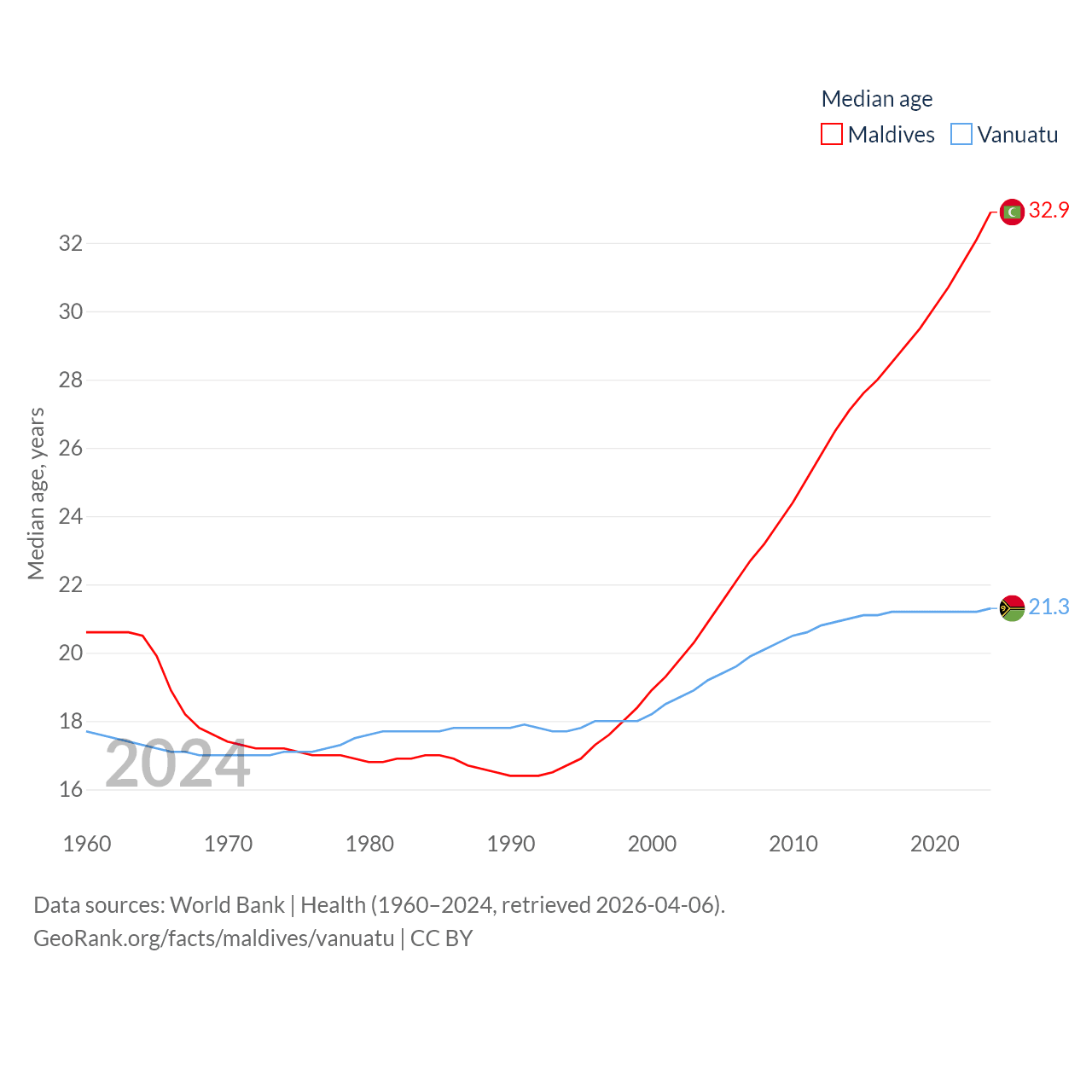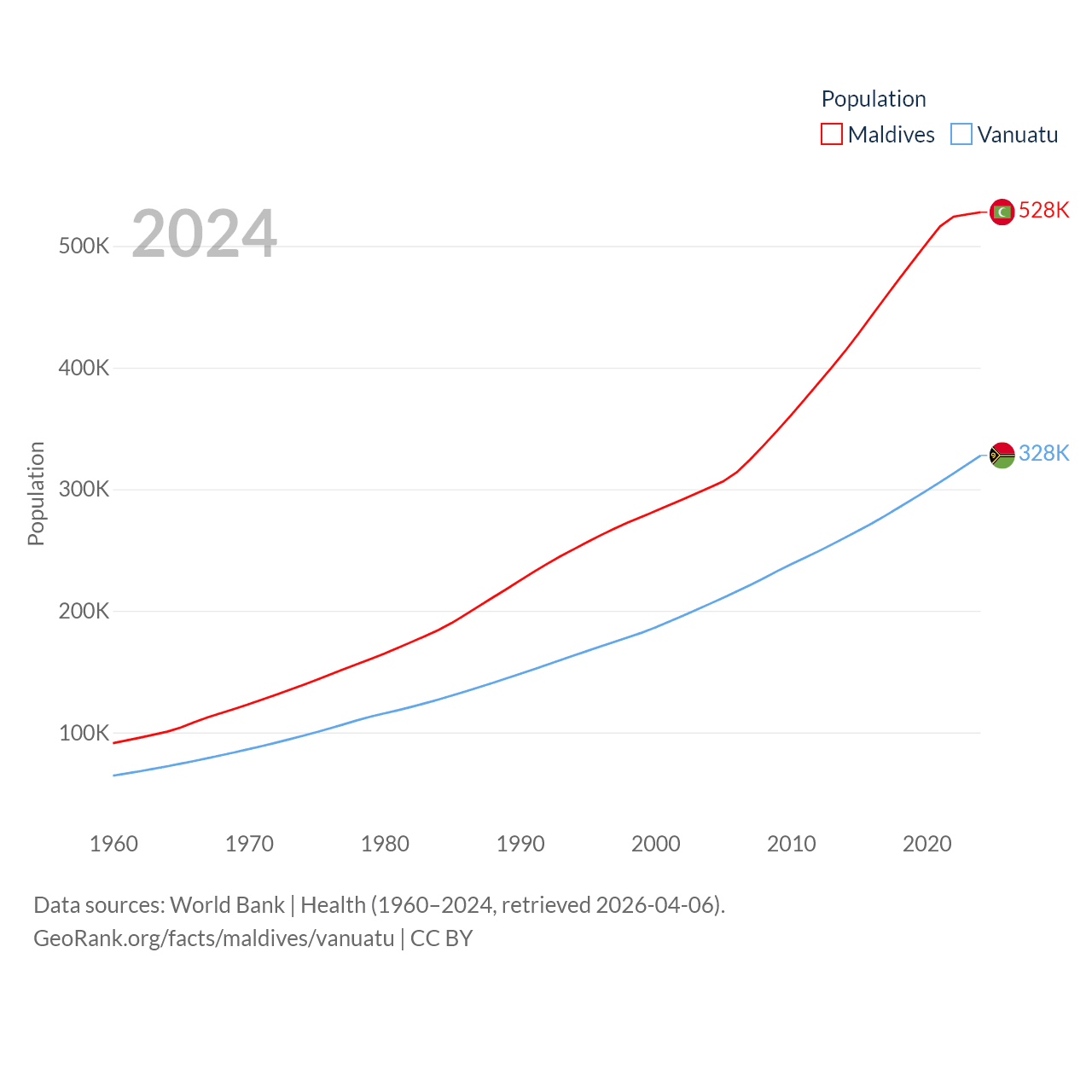 Maldives has a population of 528K (ranked 168/197), compared with 328K in Vanuatu (ranked 174/197). Maldives' land area is 115.1 sq mi versus 4,707 sq mi for Vanuatu (ranked 188th vs. 157th).
