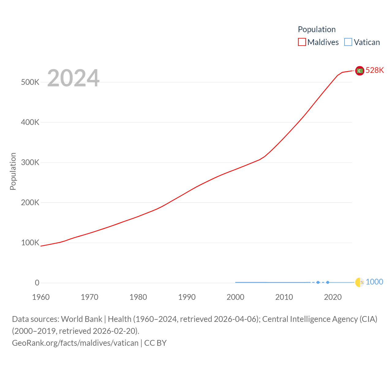 Maldives has a population of 528K (ranked 168/197), compared with 1K in The Vatican (ranked 197/197). Maldives' land area is 115.1 sq mi versus 0.17 sq mi for The Vatican (ranked 188th vs. 197th).