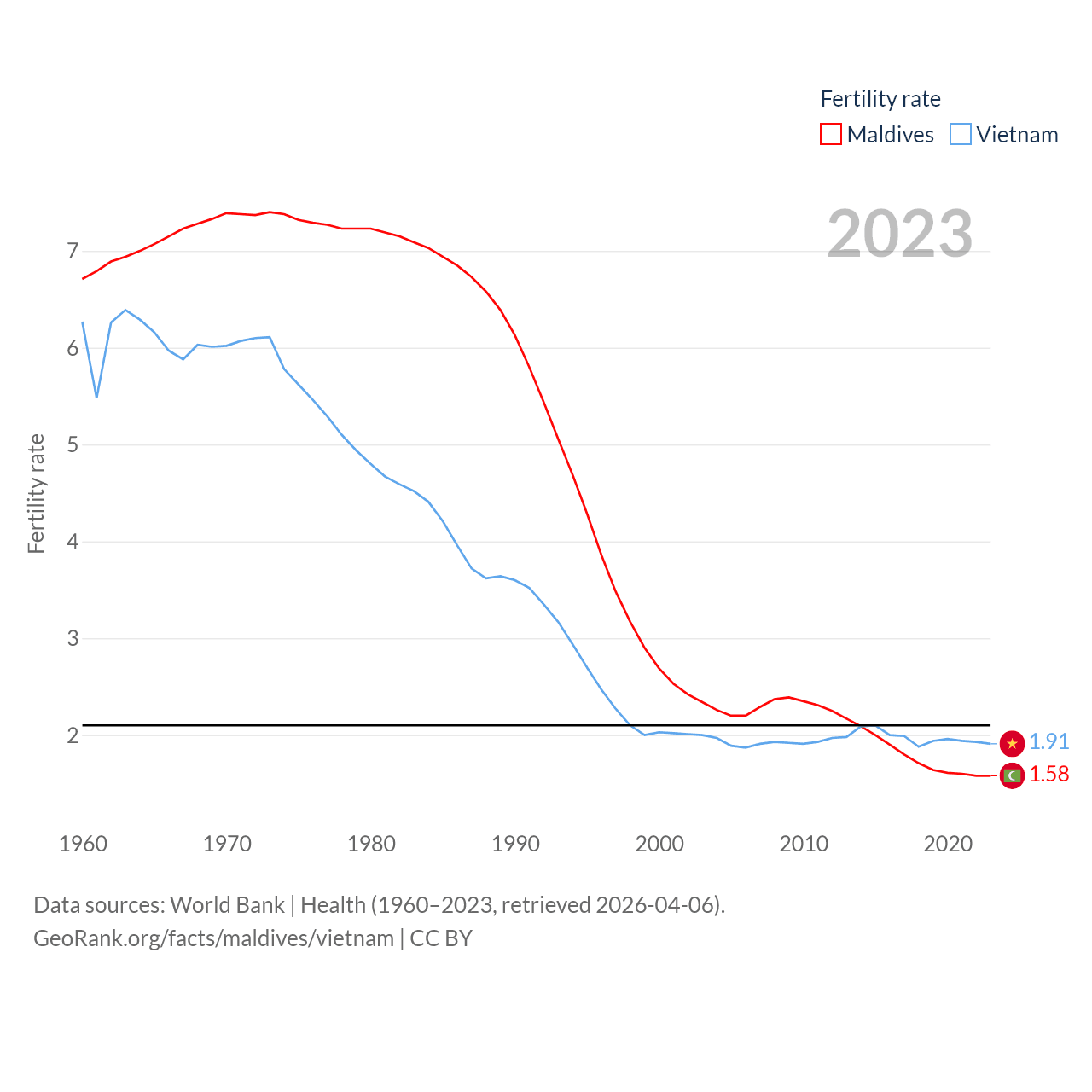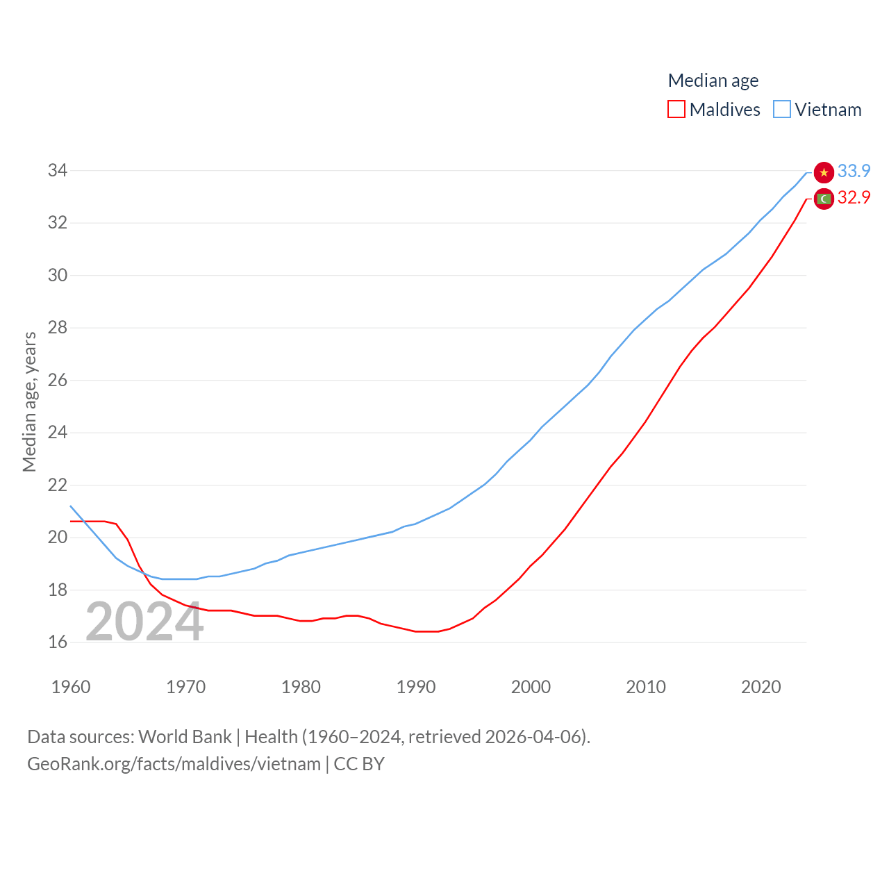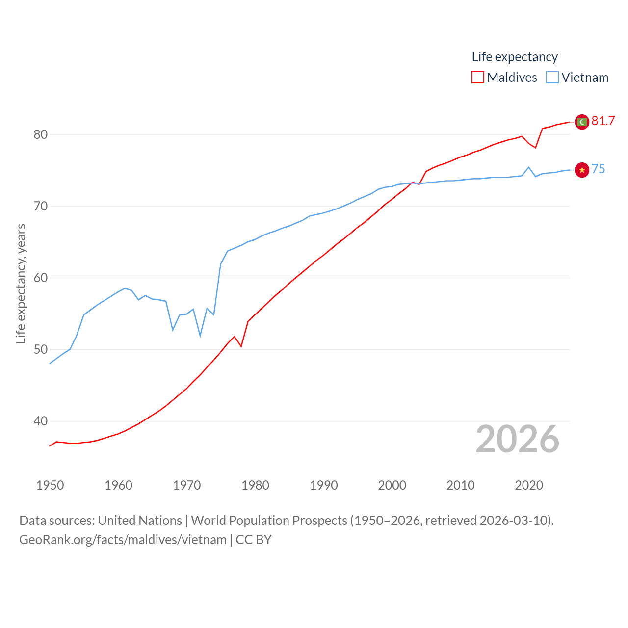 Maldives has a population of 528K (ranked 168/197), compared with 101M in Vietnam (ranked 16/197). Maldives' land area is 115.1 sq mi versus 121,016 sq mi for Vietnam (ranked 188th vs. 67th).