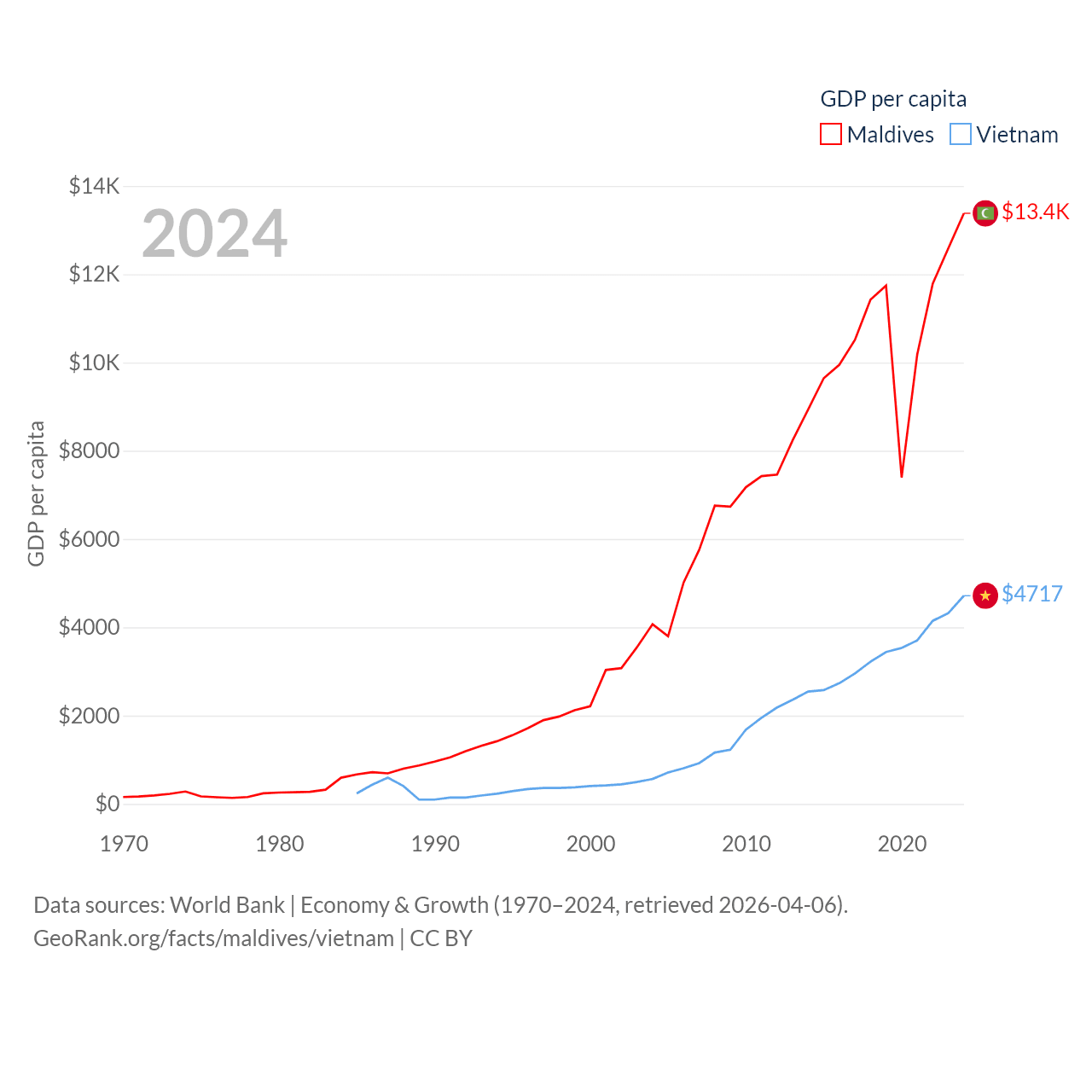 By GDP, Maldives ranks 159/197 ($7.06B) and Vietnam ranks 33/197 ($476B). By GDP per capita, Maldives ranks 75/197 ($13,379), while Vietnam ranks 122/197 ($4,717).
