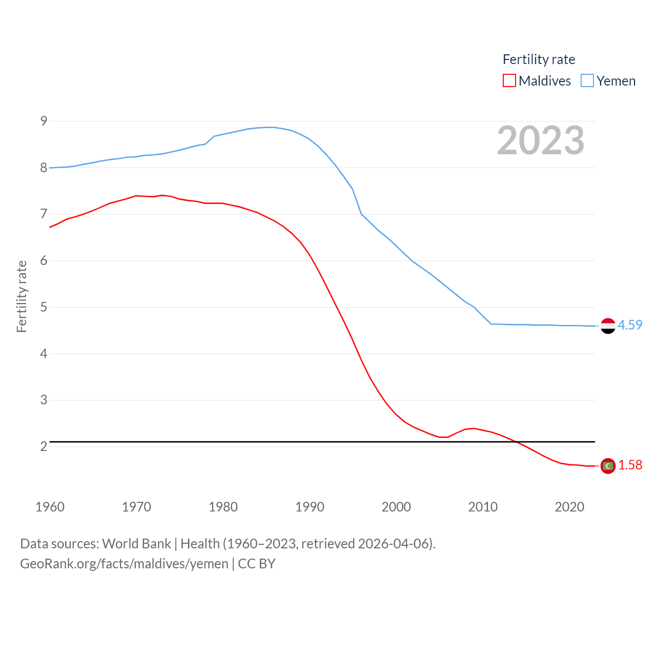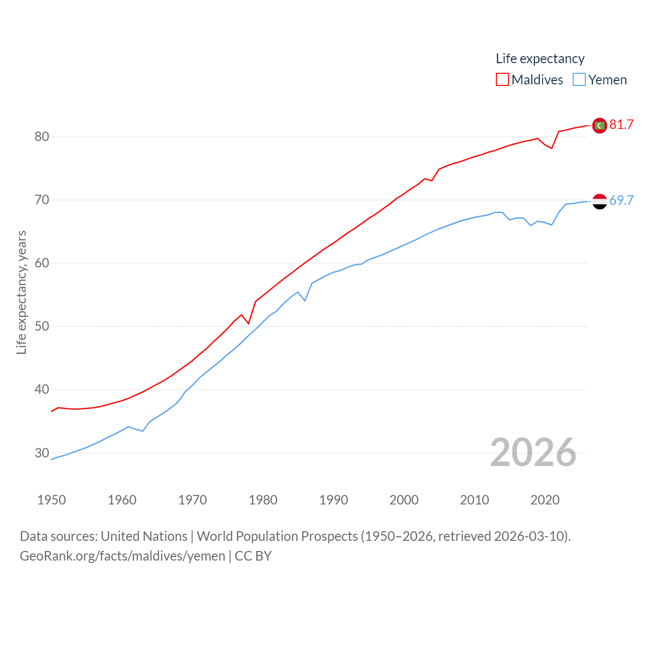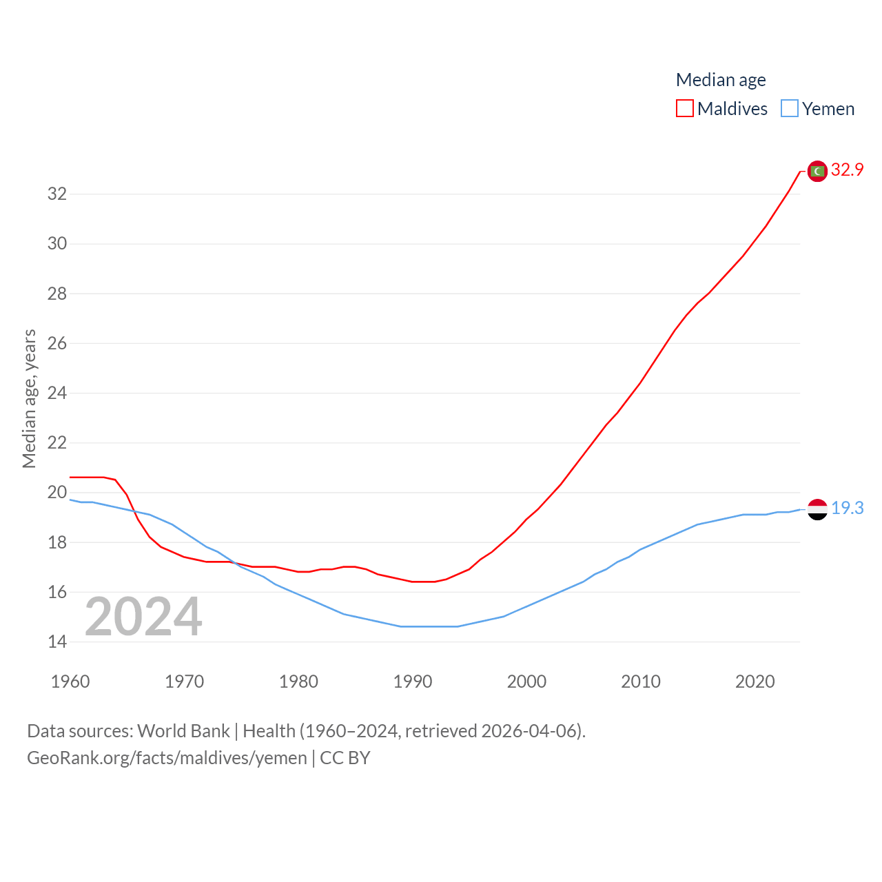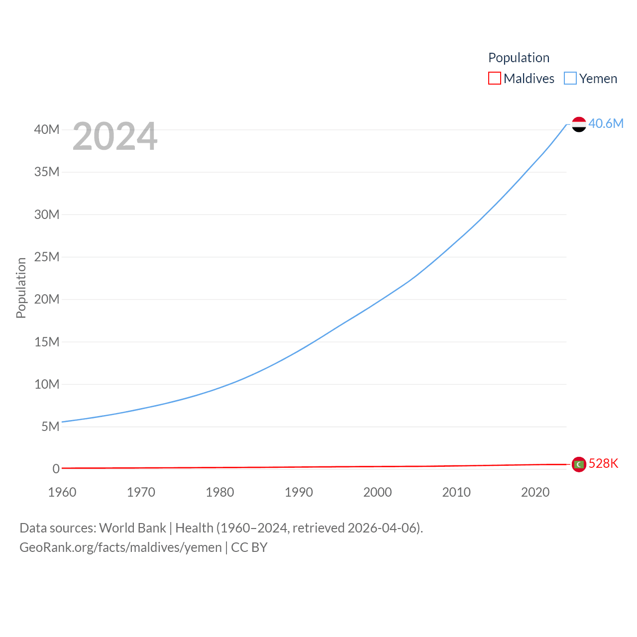 Maldives has a population of 528K (ranked 168/197), compared with 40.6M in Yemen (ranked 38/197). Maldives' land area is 115.1 sq mi versus 203,850 sq mi for Yemen (ranked 188th vs. 49th).