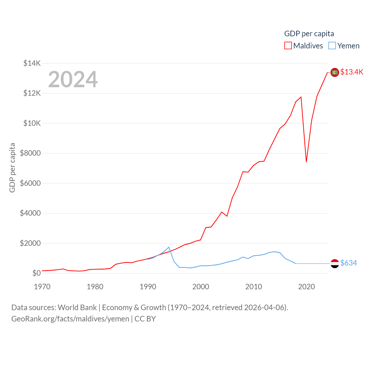 By GDP, Maldives ranks 159/197 ($7.06B) and Yemen ranks 125/197 ($21.6B). By GDP per capita, Maldives ranks 75/197 ($13,379), while Yemen ranks 191/197 ($634).