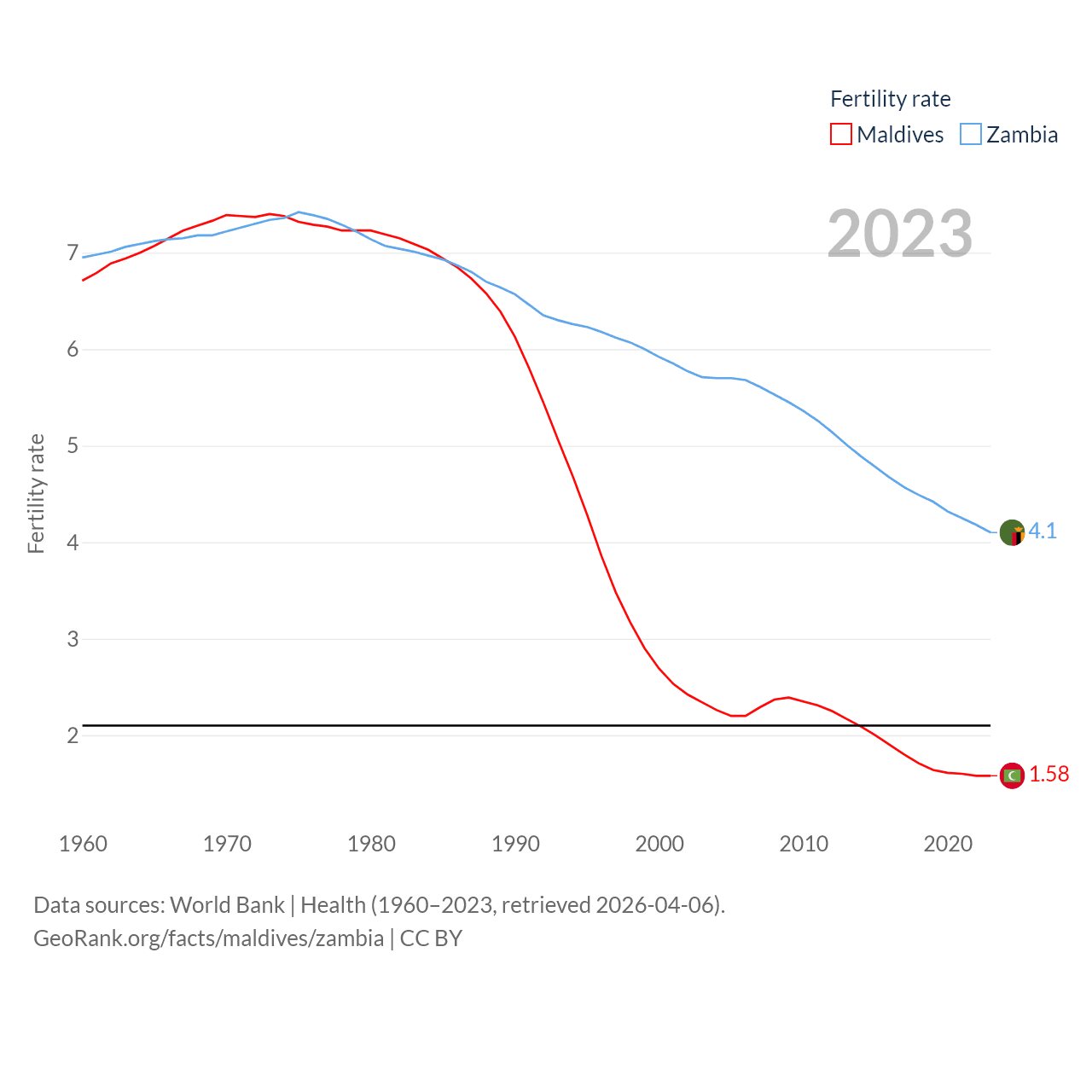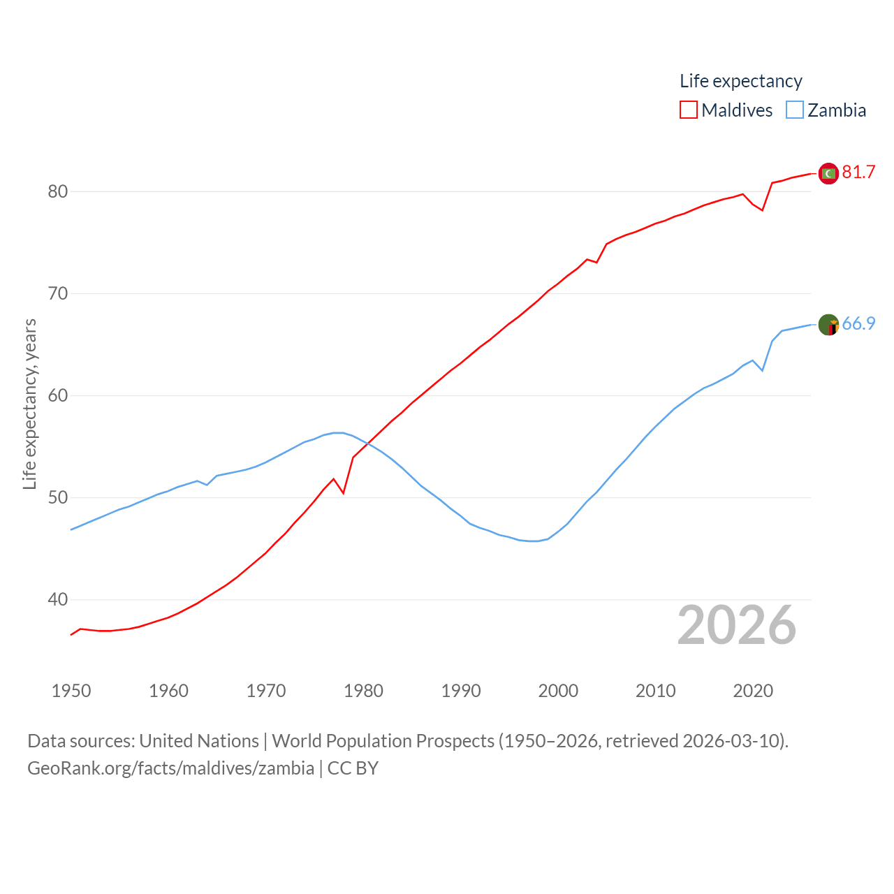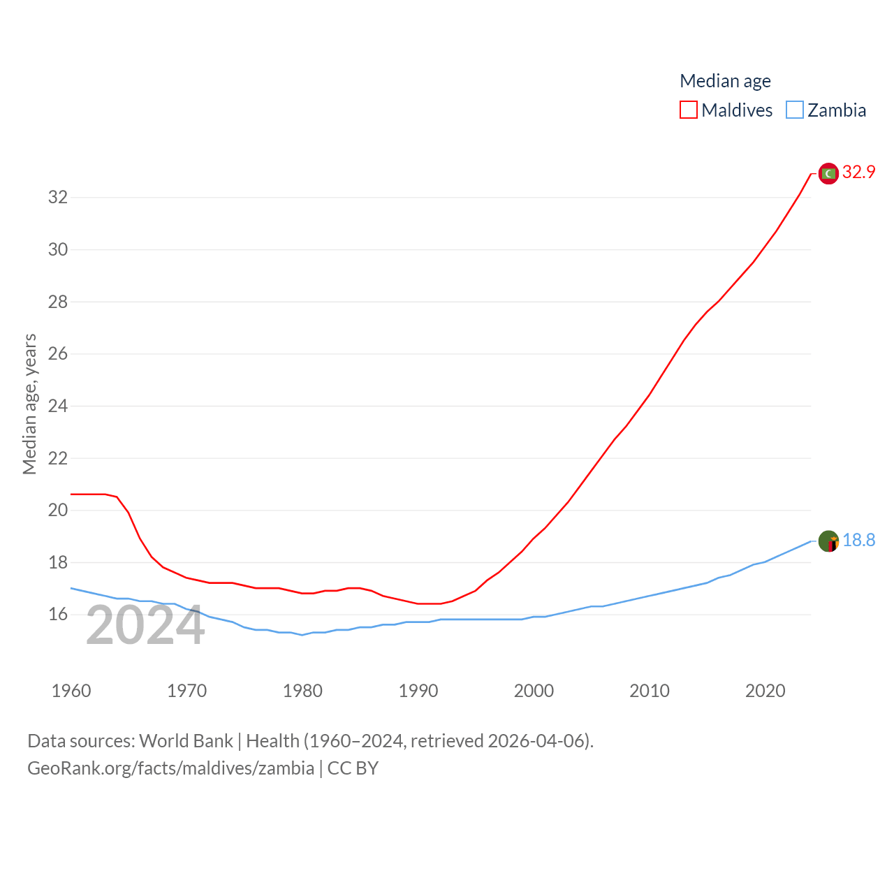 Maldives has a population of 528K (ranked 168/197), compared with 21.3M in Zambia (ranked 63/197). Maldives' land area is 115.1 sq mi versus 287,024 sq mi for Zambia (ranked 188th vs. 37th).