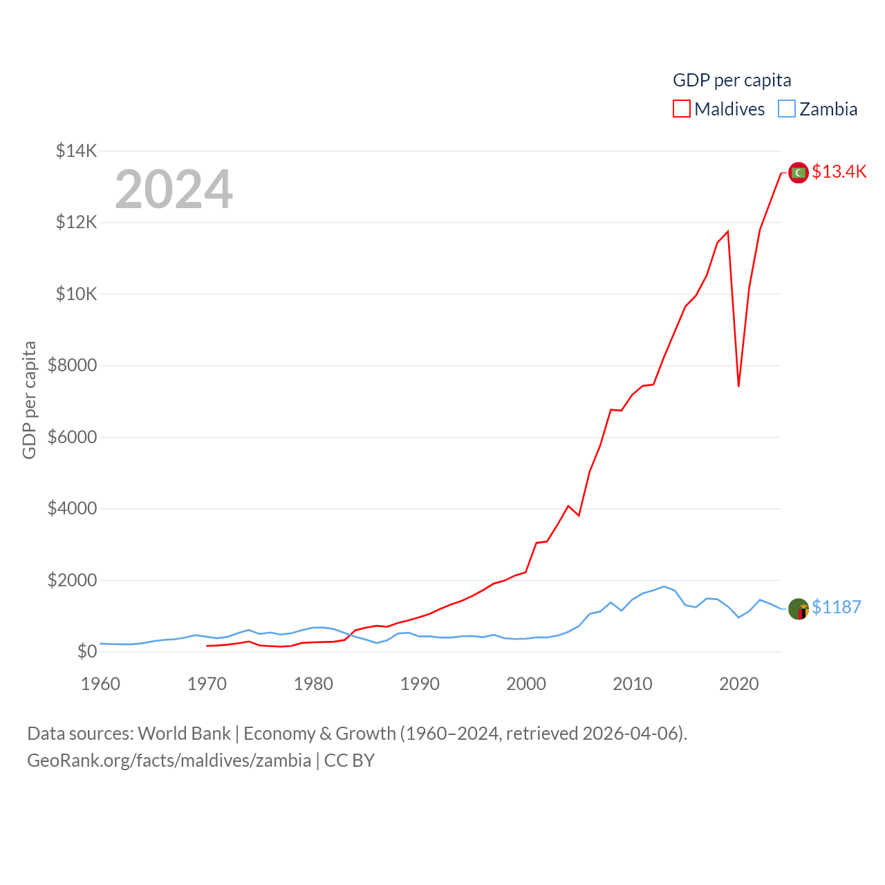 By GDP, Maldives ranks 159/197 ($7.06B) and Zambia ranks 116/197 ($25.3B). By GDP per capita, Maldives ranks 75/197 ($13,379), while Zambia ranks 169/197 ($1,187).