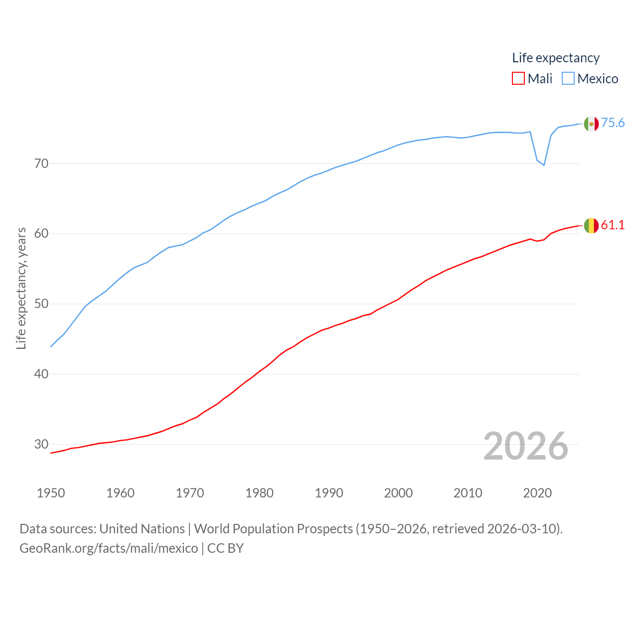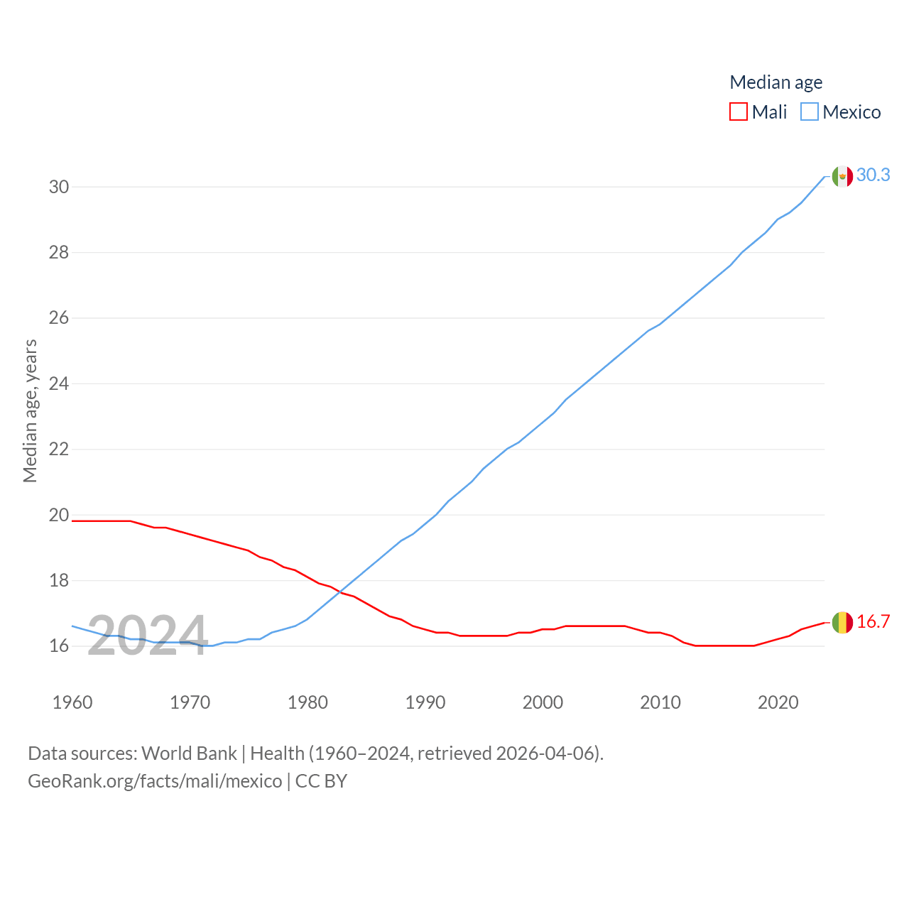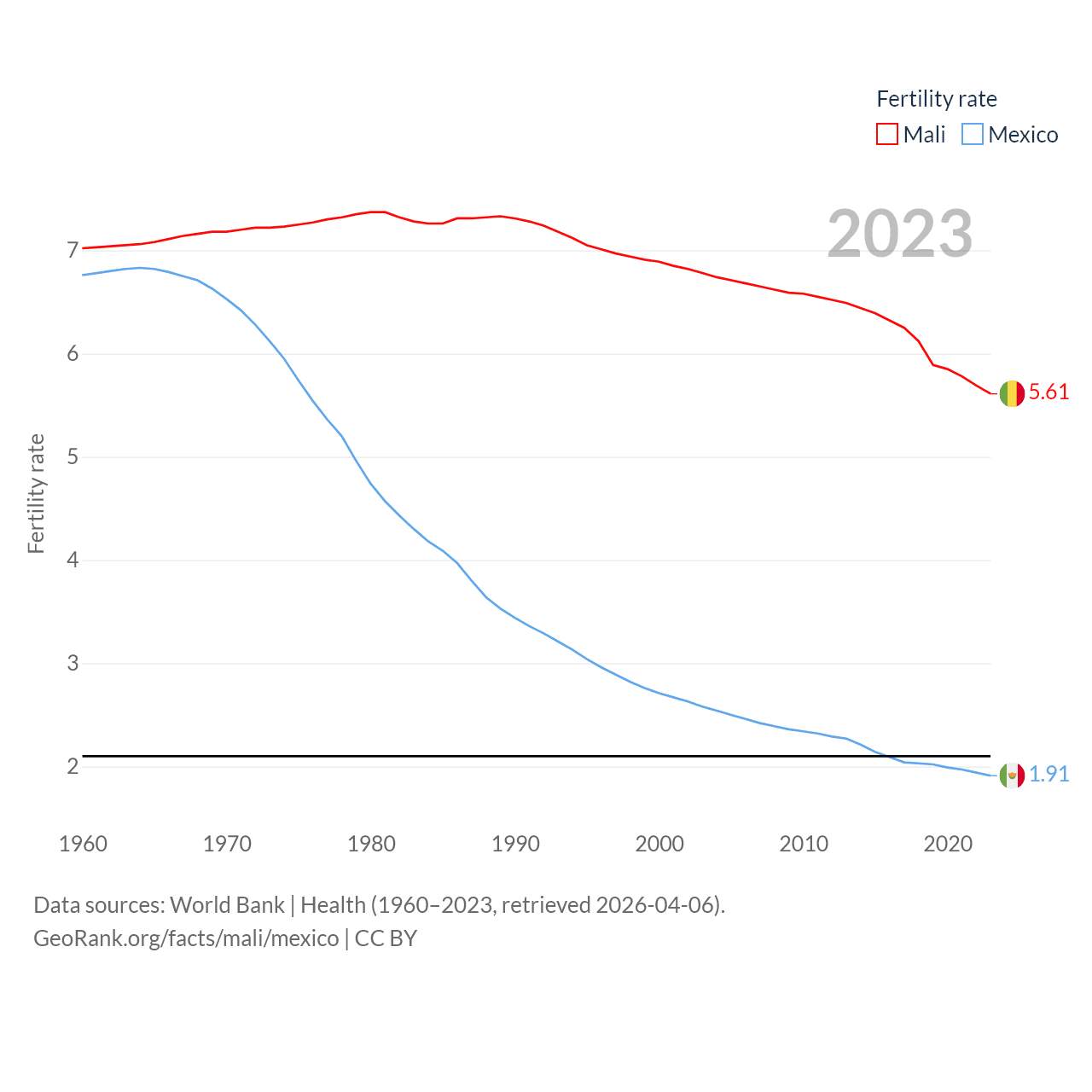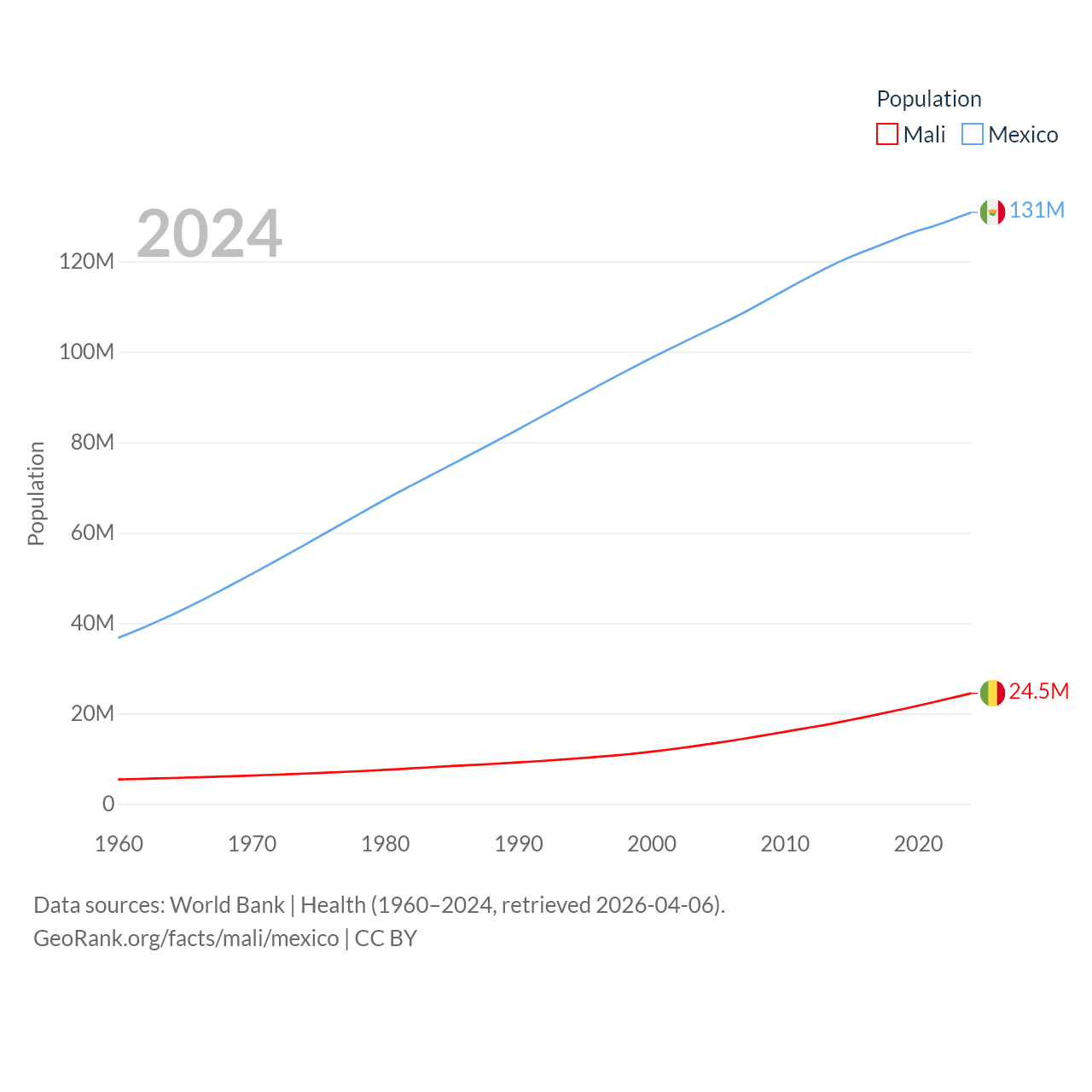 Mali has a population of 24.5M (ranked 58/197), compared with 131M in Mexico (ranked 11/197). Mali's land area is 471,118 sq mi versus 750,563 sq mi for Mexico (ranked 23rd vs. 13th).