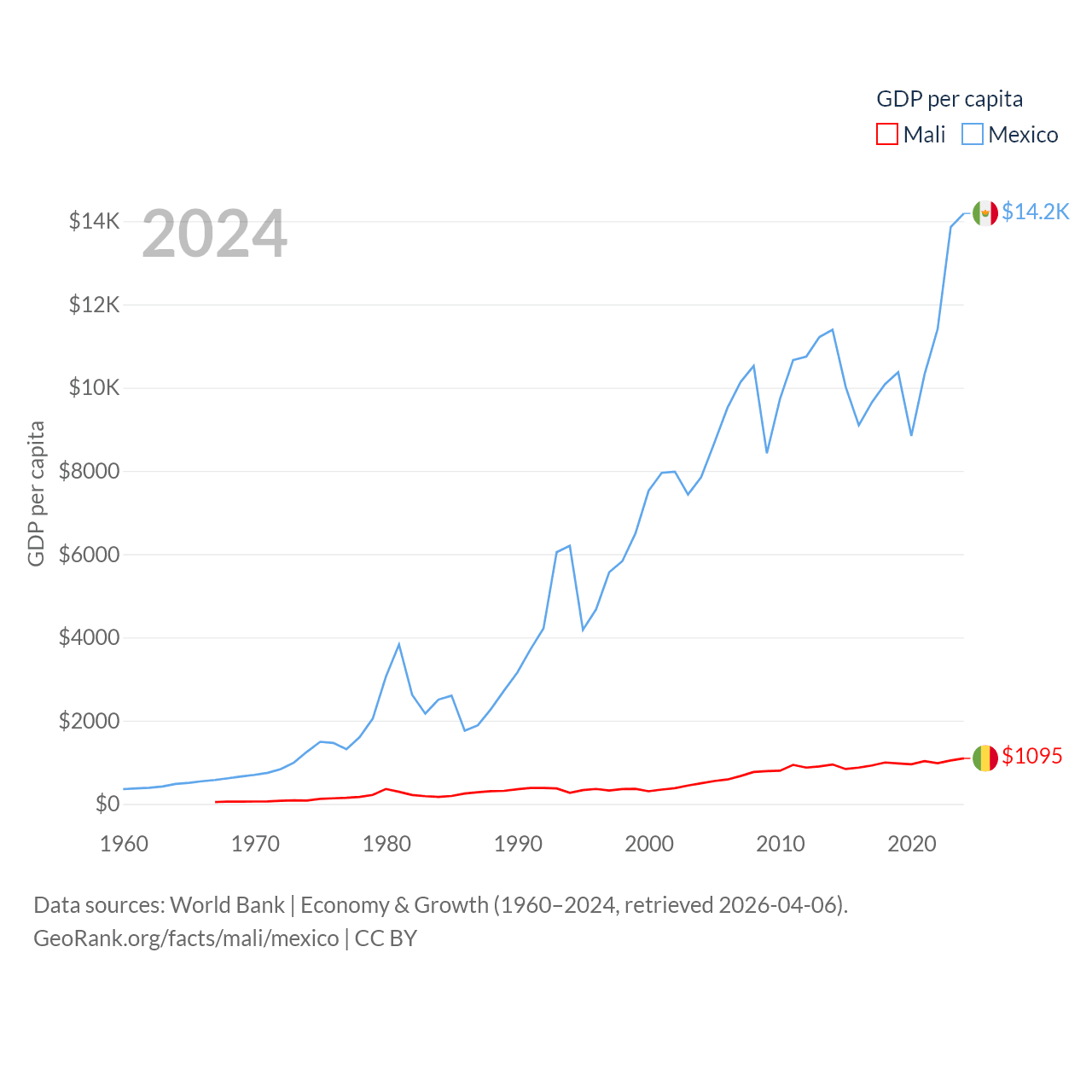 By GDP, Mali ranks 113/197 ($26.8B) and Mexico ranks 13/197 ($1.86T). By GDP per capita, Mali ranks 173/197 ($1,095), while Mexico ranks 69/197 ($14,186).