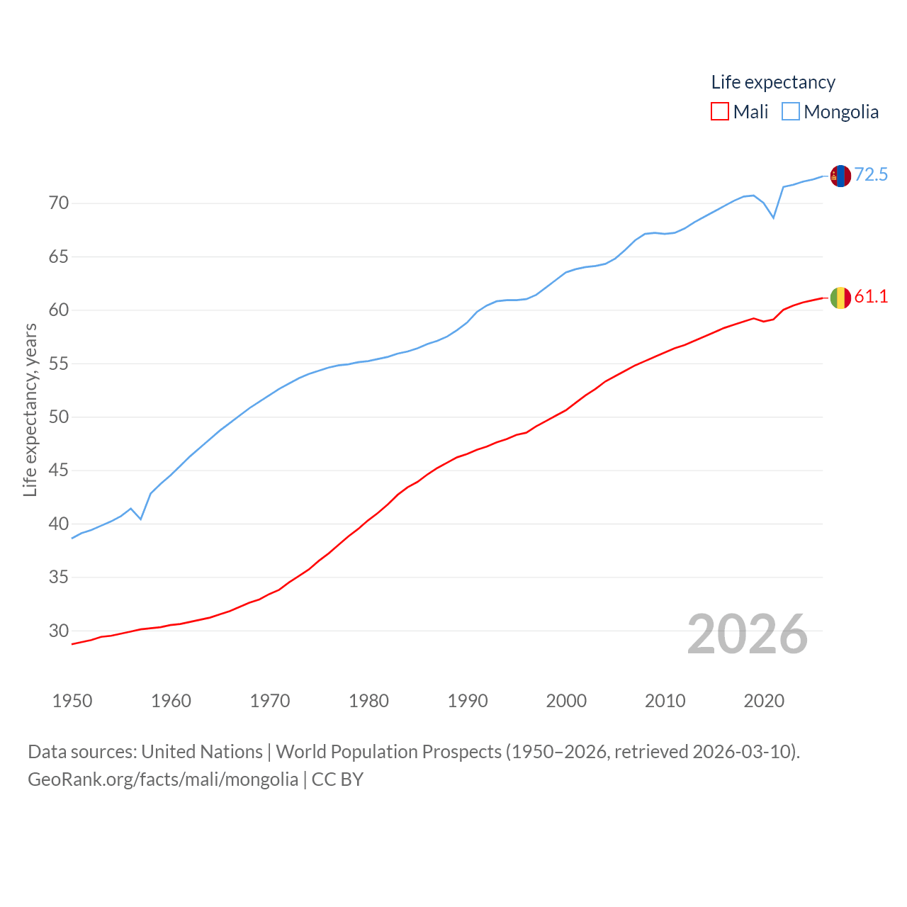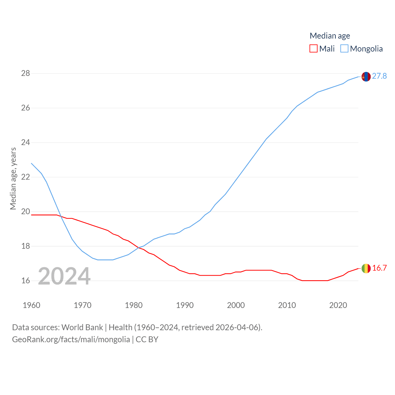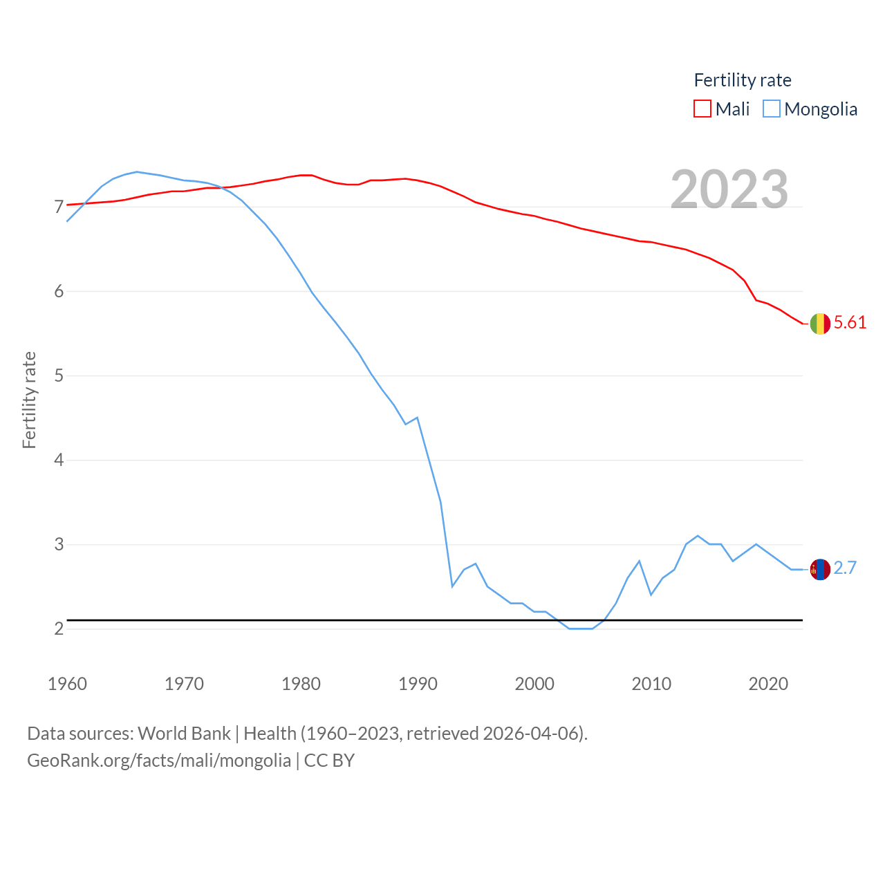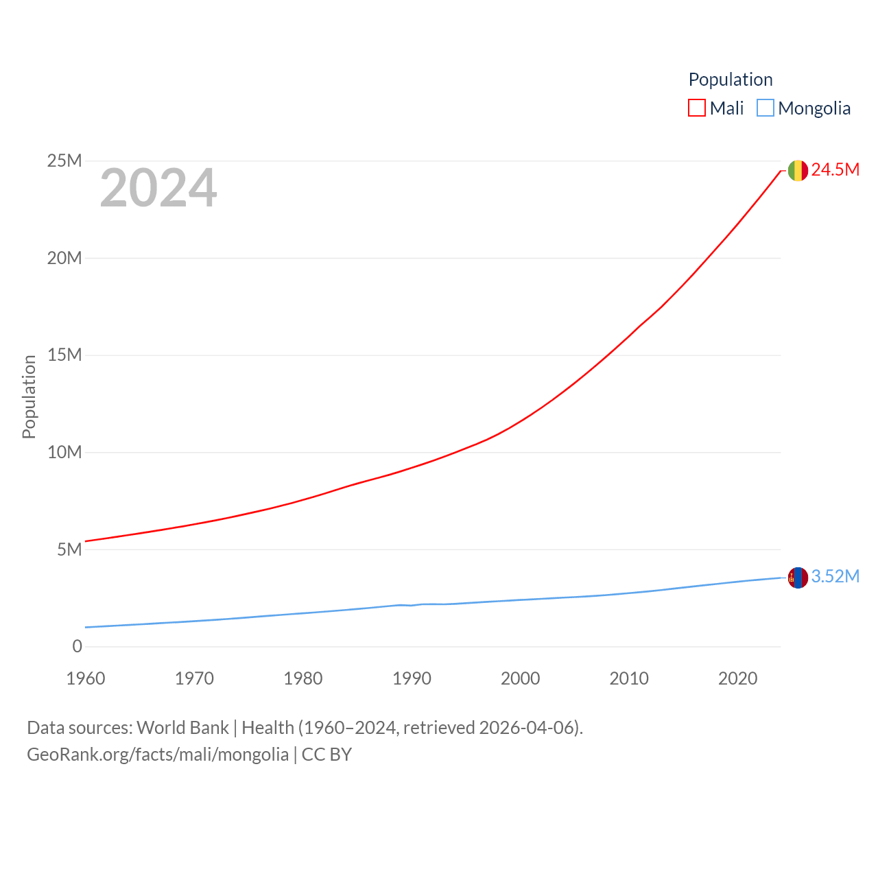 Mali has a population of 24.5M (ranked 58/197), compared with 3.52M in Mongolia (ranked 132/197). Mali's land area is 471,118 sq mi versus 601,740 sq mi for Mongolia (ranked 23rd vs. 18th).