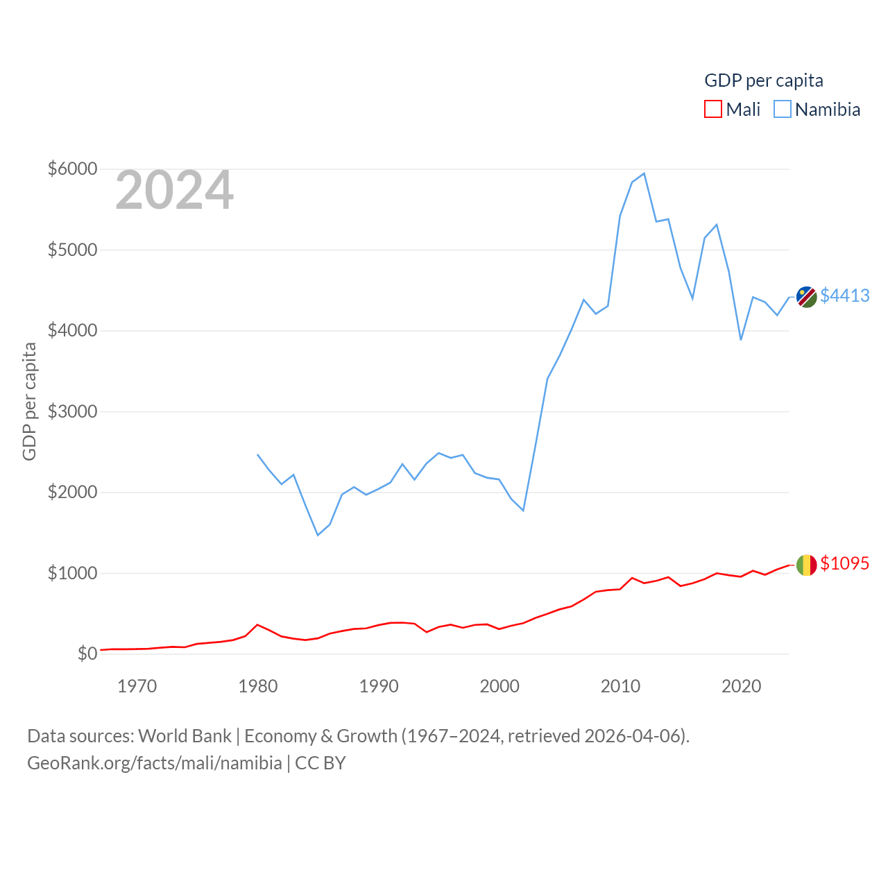 By GDP, Mali ranks 113/197 ($26.8B) and Namibia ranks 147/197 ($13.4B). By GDP per capita, Mali ranks 173/197 ($1,095), while Namibia ranks 126/197 ($4,413).