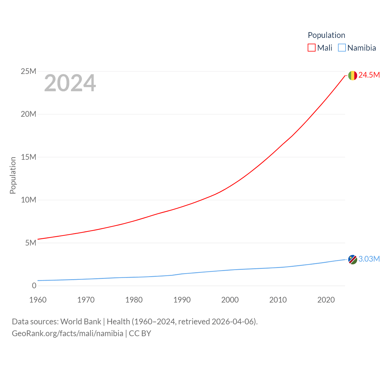 Mali has a population of 24.5M (ranked 58/197), compared with 3.03M in Namibia (ranked 136/197). Mali's land area is 471,118 sq mi versus 317,874 sq mi for Namibia (ranked 23rd vs. 33rd).