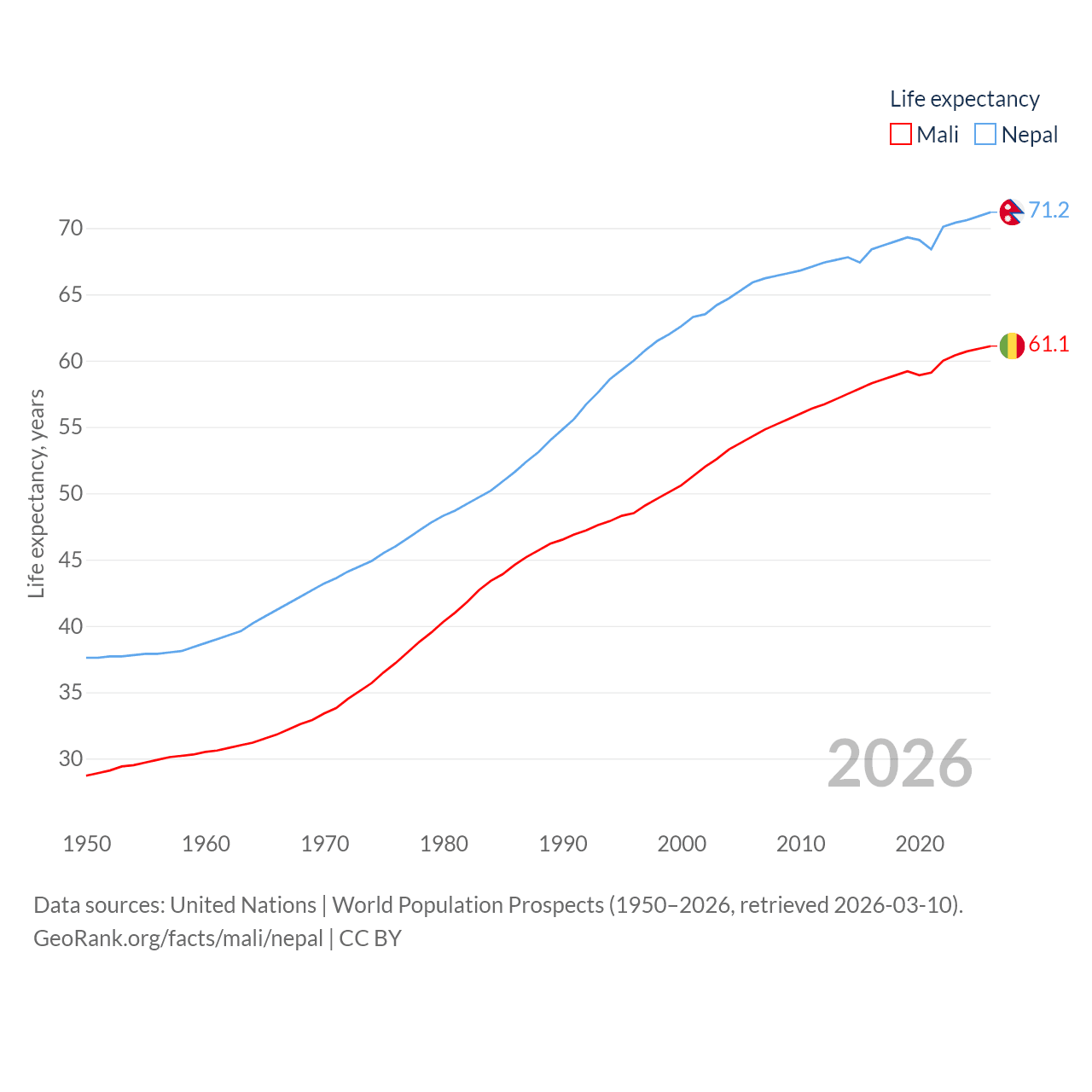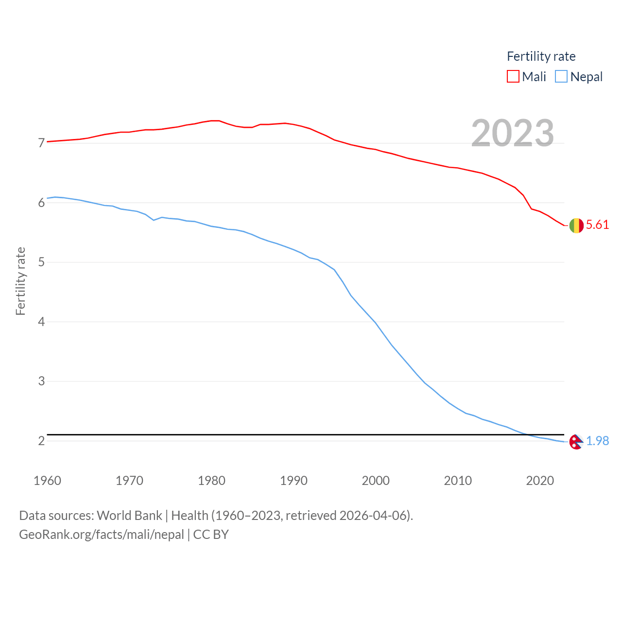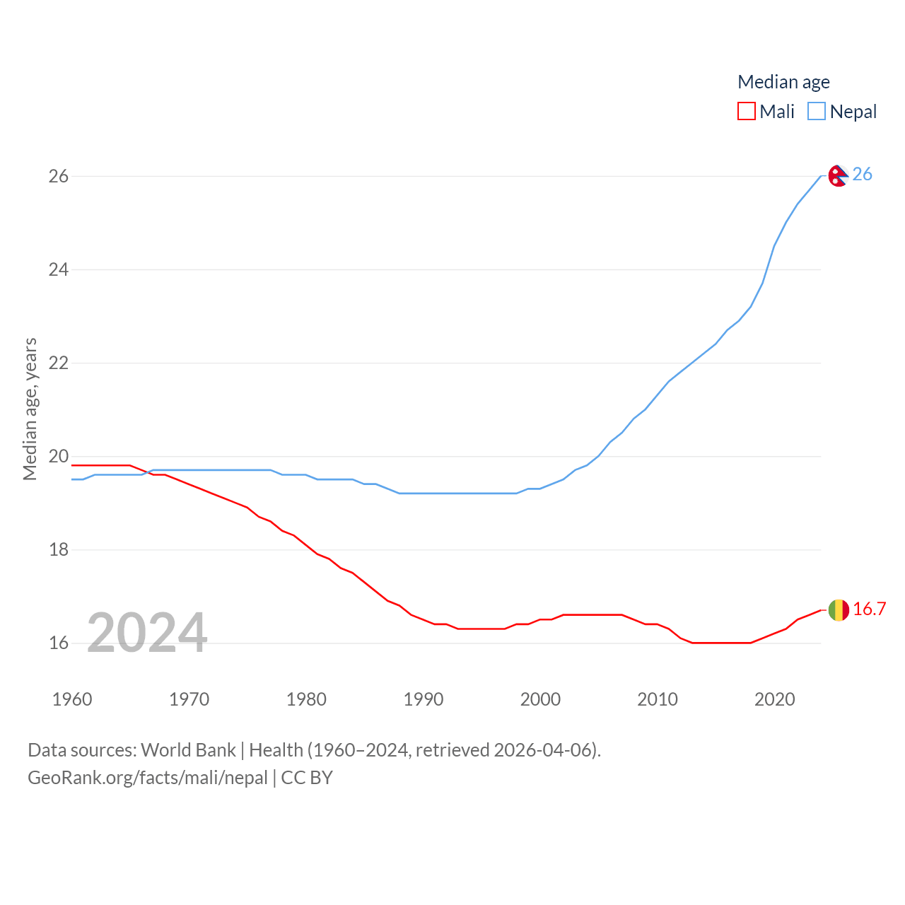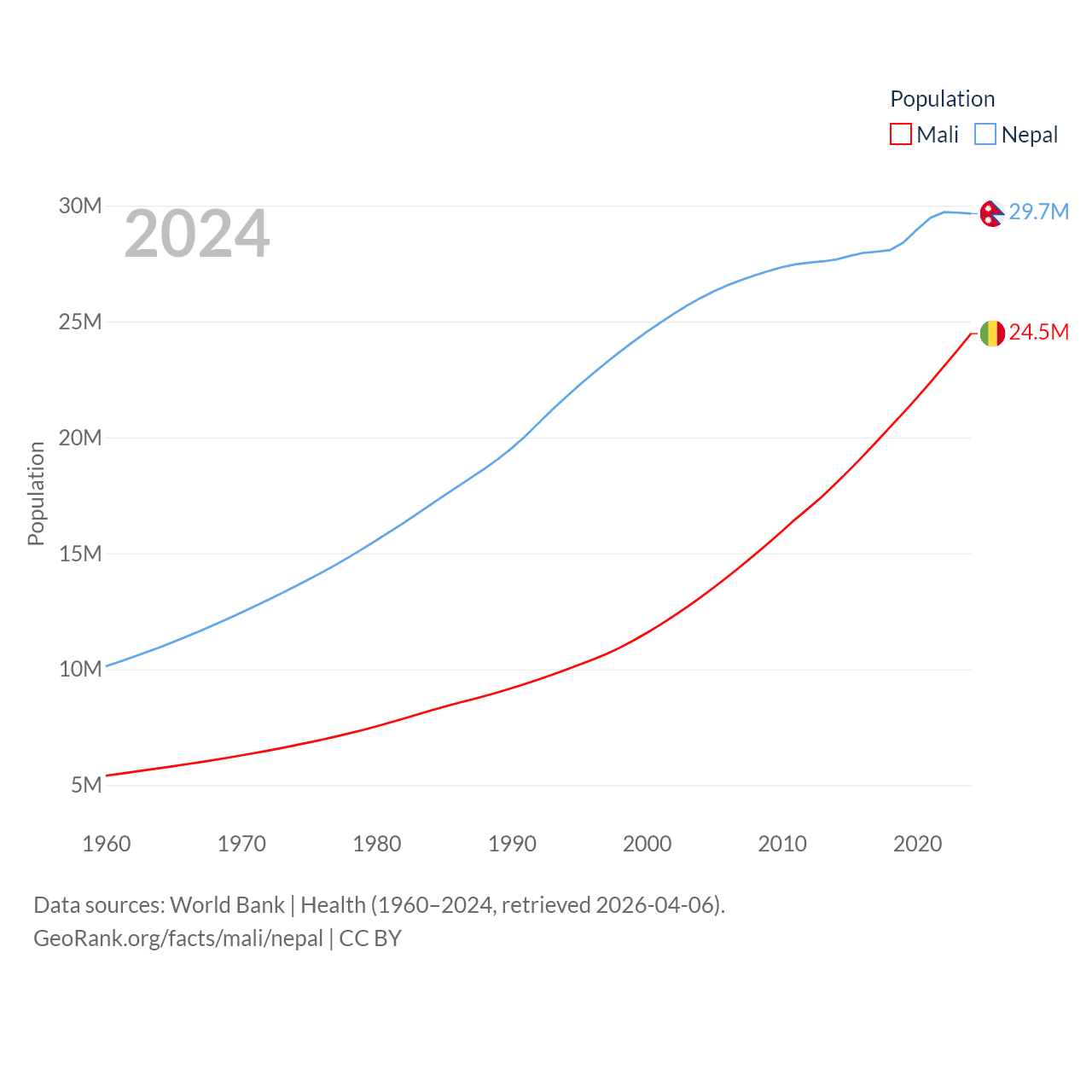 Mali has a population of 24.5M (ranked 58/197), compared with 29.7M in Nepal (ranked 51/197). Mali's land area is 471,118 sq mi versus 55,348 sq mi for Nepal (ranked 23rd vs. 92nd).