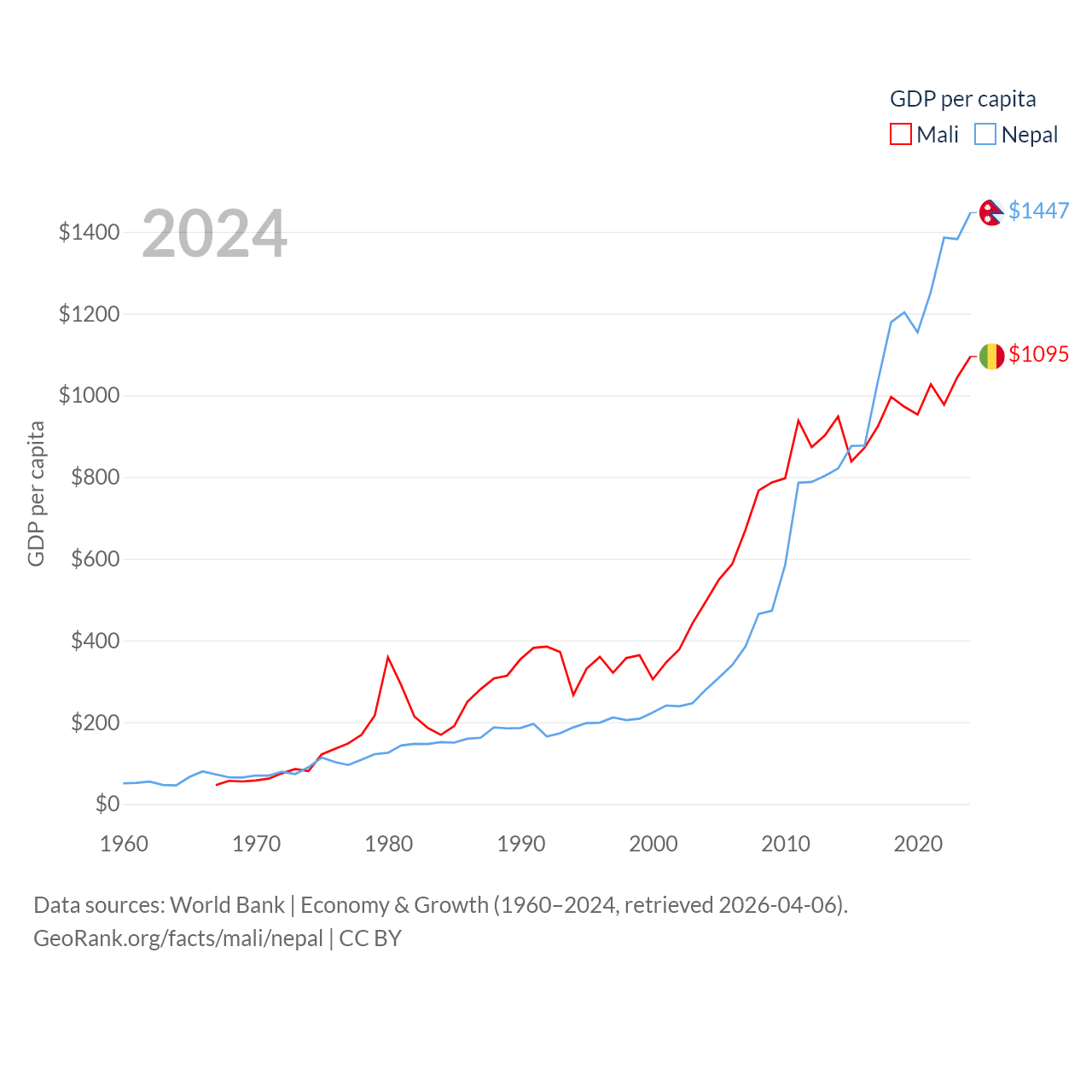 By GDP, Mali ranks 113/197 ($26.8B) and Nepal ranks 101/197 ($42.9B). By GDP per capita, Mali ranks 173/197 ($1,095), while Nepal ranks 164/197 ($1,447).