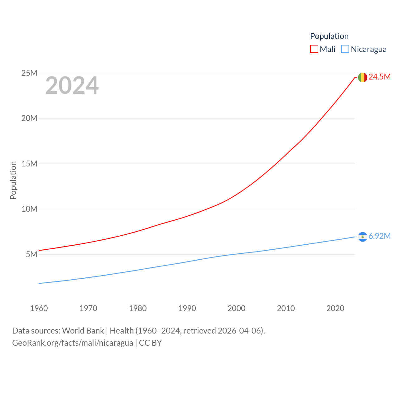 Mali has a population of 24.5M (ranked 58/197), compared with 6.92M in Nicaragua (ranked 108/197). Mali's land area is 471,118 sq mi versus 46,464 sq mi for Nicaragua (ranked 23rd vs. 98th).