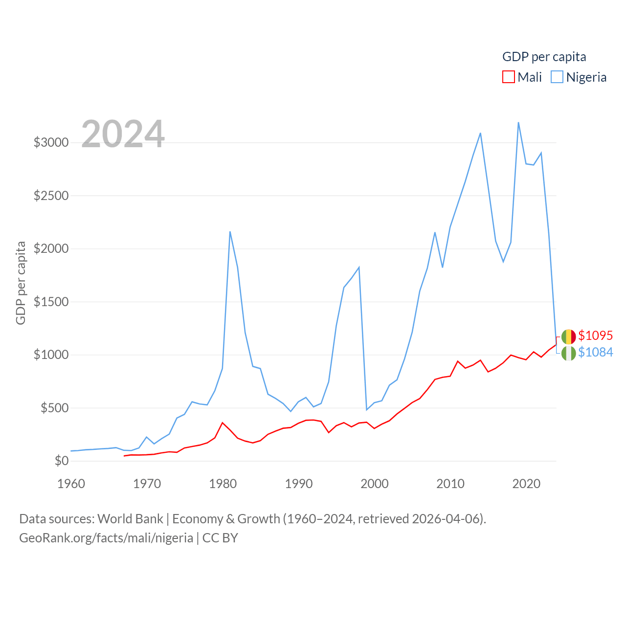 By GDP, Mali ranks 113/197 ($26.8B) and Nigeria ranks 54/197 ($252B). By GDP per capita, Mali ranks 173/197 ($1,095), while Nigeria ranks 174/197 ($1,084).