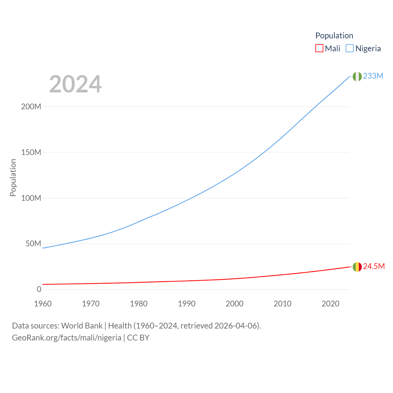 Mali has a population of 24.5M (ranked 58/197), compared with 233M in Nigeria (ranked 6/197). Mali's land area is 471,118 sq mi versus 351,650 sq mi for Nigeria (ranked 23rd vs. 30th).