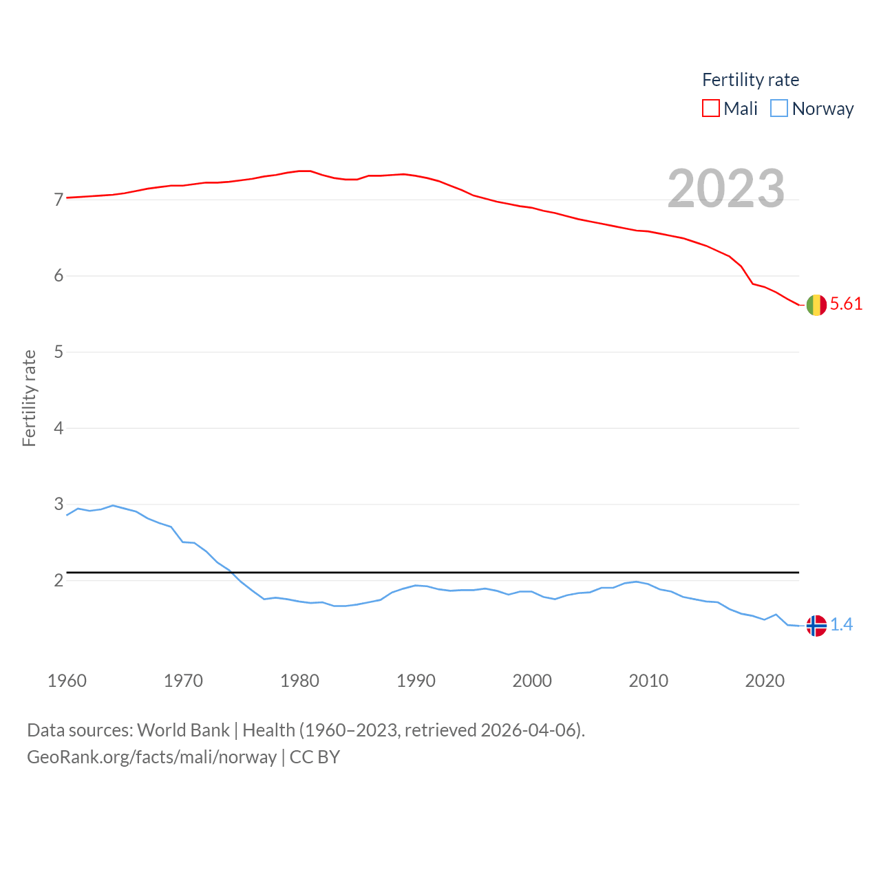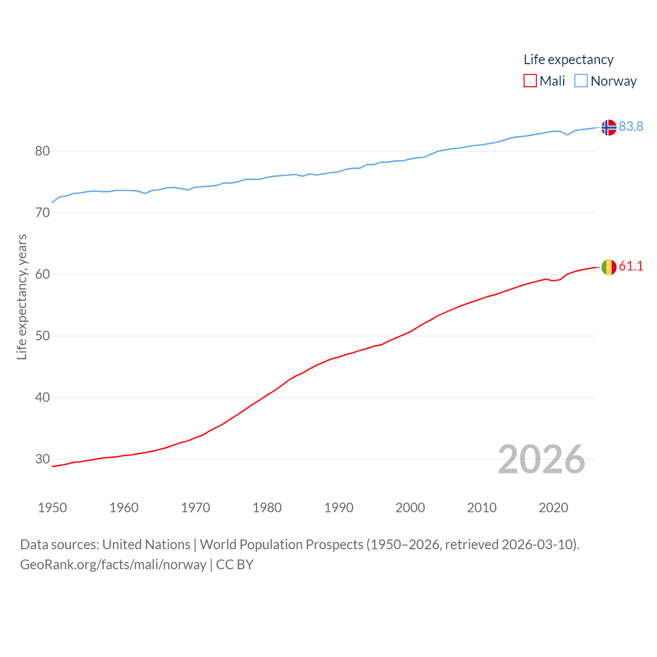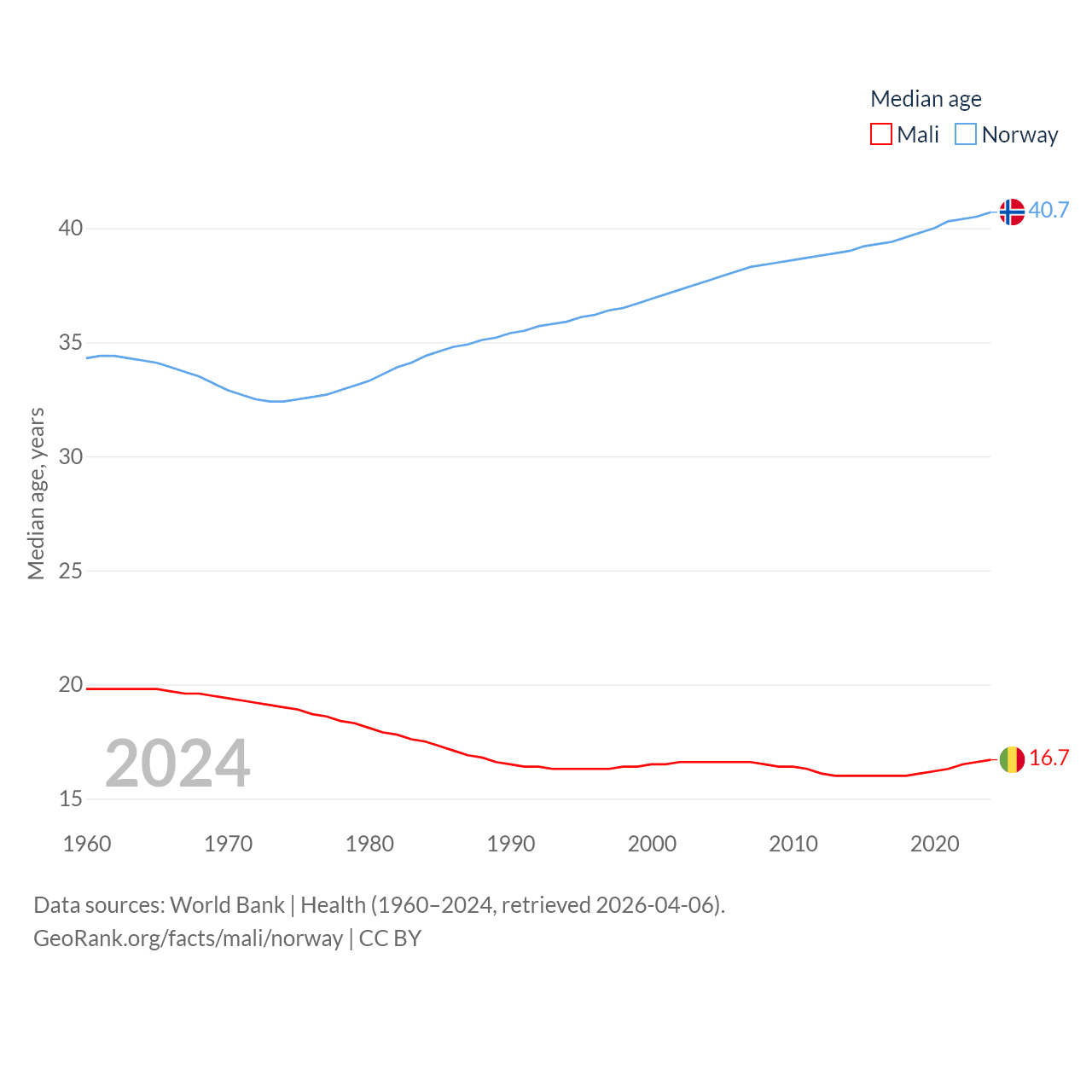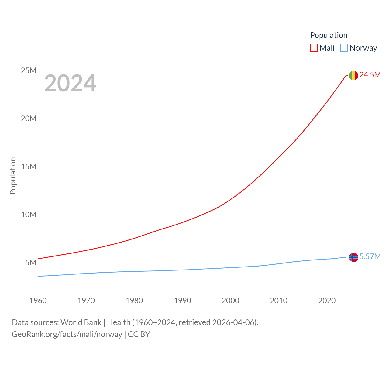 Mali has a population of 24.5M (ranked 58/197), compared with 5.57M in Norway (ranked 118/197). Mali's land area is 471,118 sq mi versus 140,645 sq mi for Norway (ranked 23rd vs. 62nd).