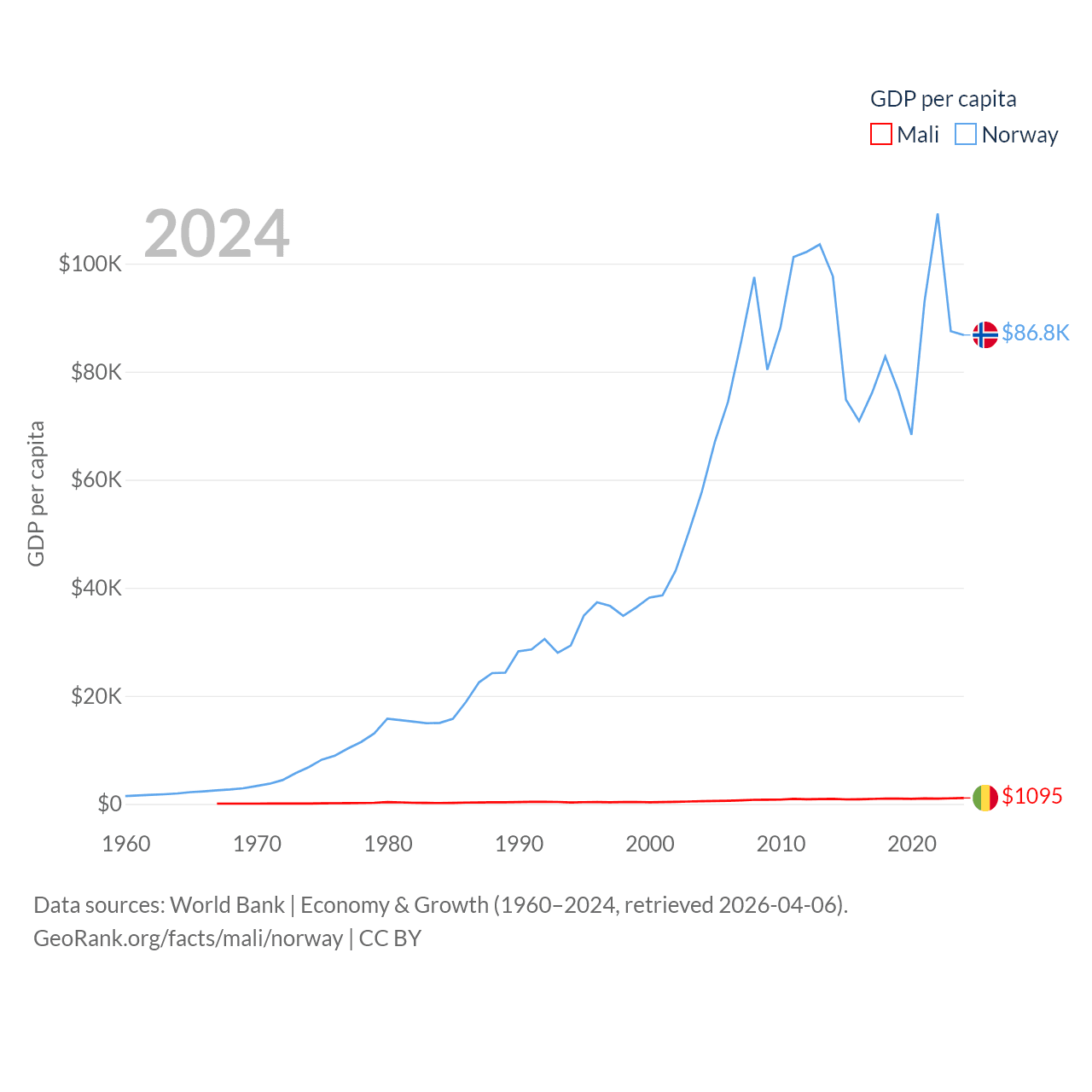 By GDP, Mali ranks 113/197 ($26.8B) and Norway ranks 32/197 ($484B). By GDP per capita, Mali ranks 173/197 ($1,095), while Norway ranks 8/197 ($86,785).
