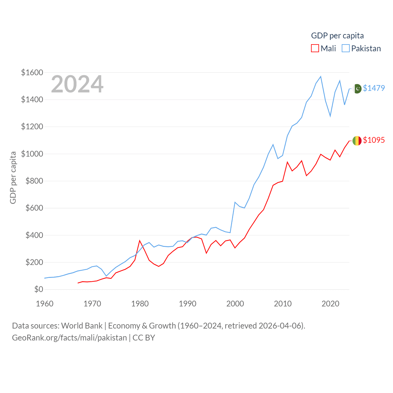 By GDP, Mali ranks 113/197 ($26.8B) and Pakistan ranks 43/197 ($372B). By GDP per capita, Mali ranks 173/197 ($1,095), while Pakistan ranks 163/197 ($1,479).