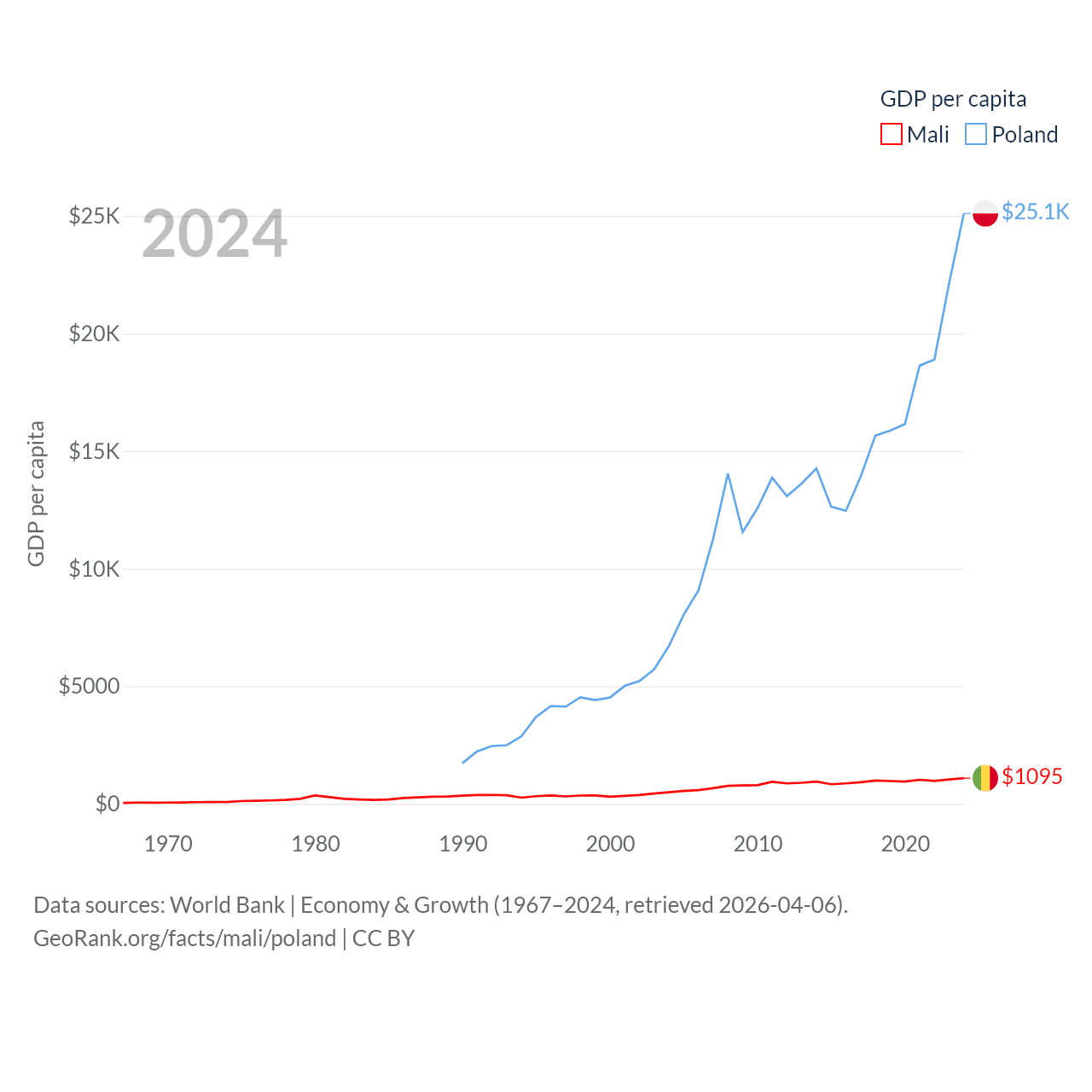 By GDP, Mali ranks 113/197 ($26.8B) and Poland ranks 21/197 ($918B). By GDP per capita, Mali ranks 173/197 ($1,095), while Poland ranks 48/197 ($25,104).