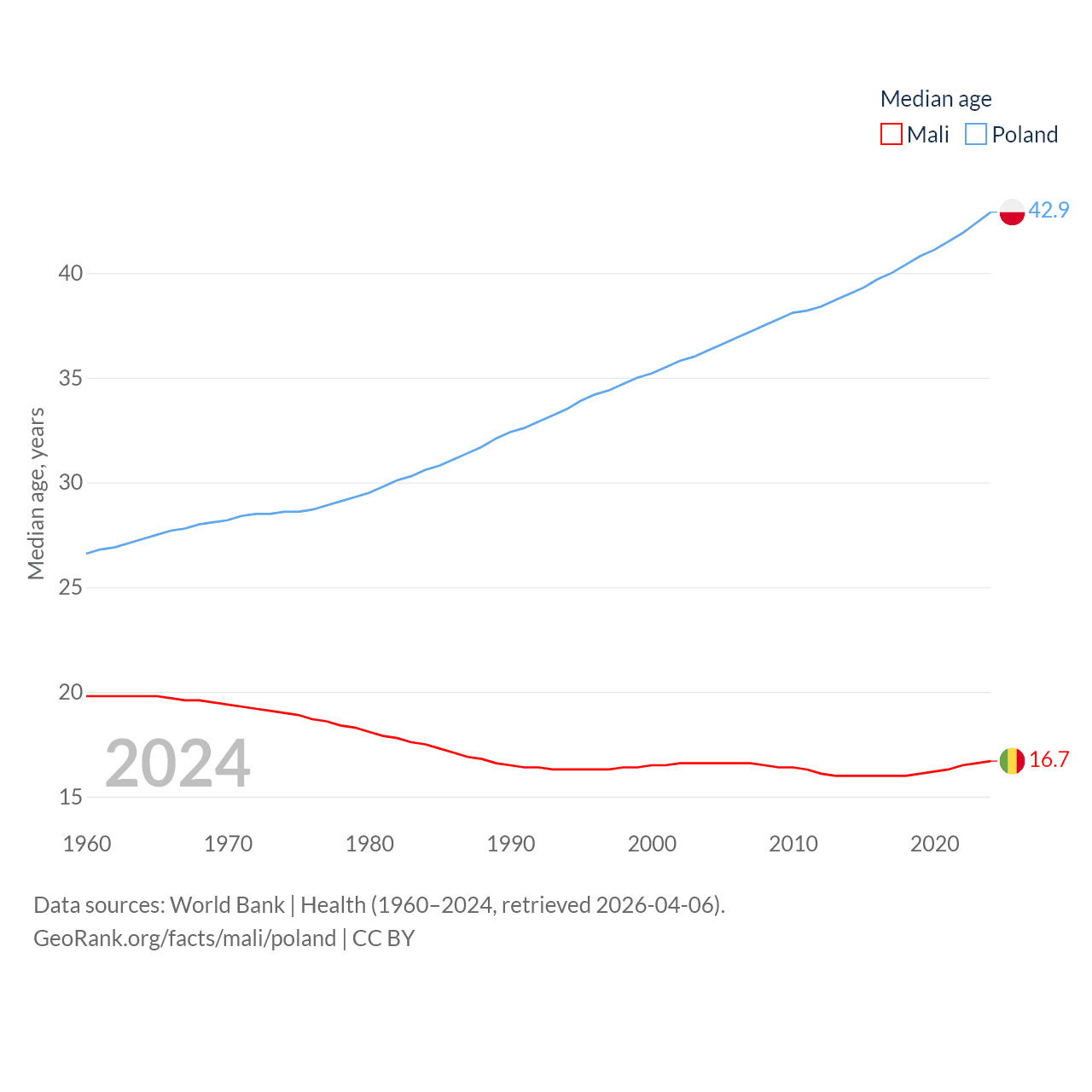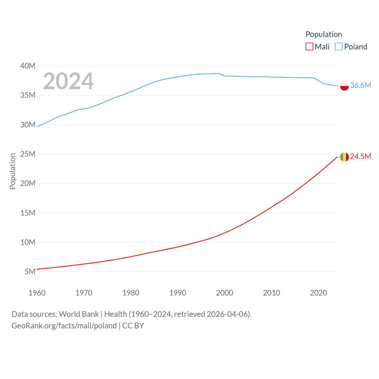 Mali has a population of 24.5M (ranked 58/197), compared with 36.6M in Poland (ranked 42/197). Mali's land area is 471,118 sq mi versus 118,252 sq mi for Poland (ranked 23rd vs. 69th).