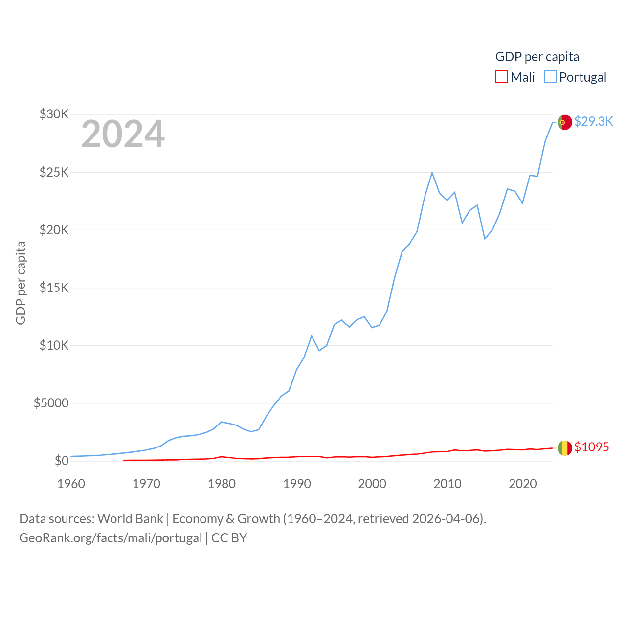 By GDP, Mali ranks 113/197 ($26.8B) and Portugal ranks 46/197 ($313B). By GDP per capita, Mali ranks 173/197 ($1,095), while Portugal ranks 44/197 ($29,292).