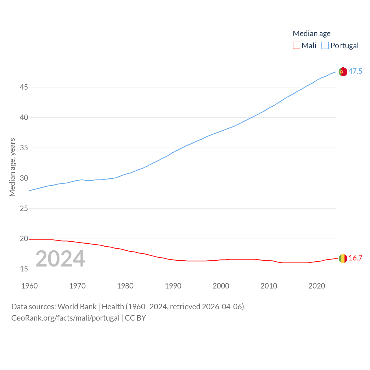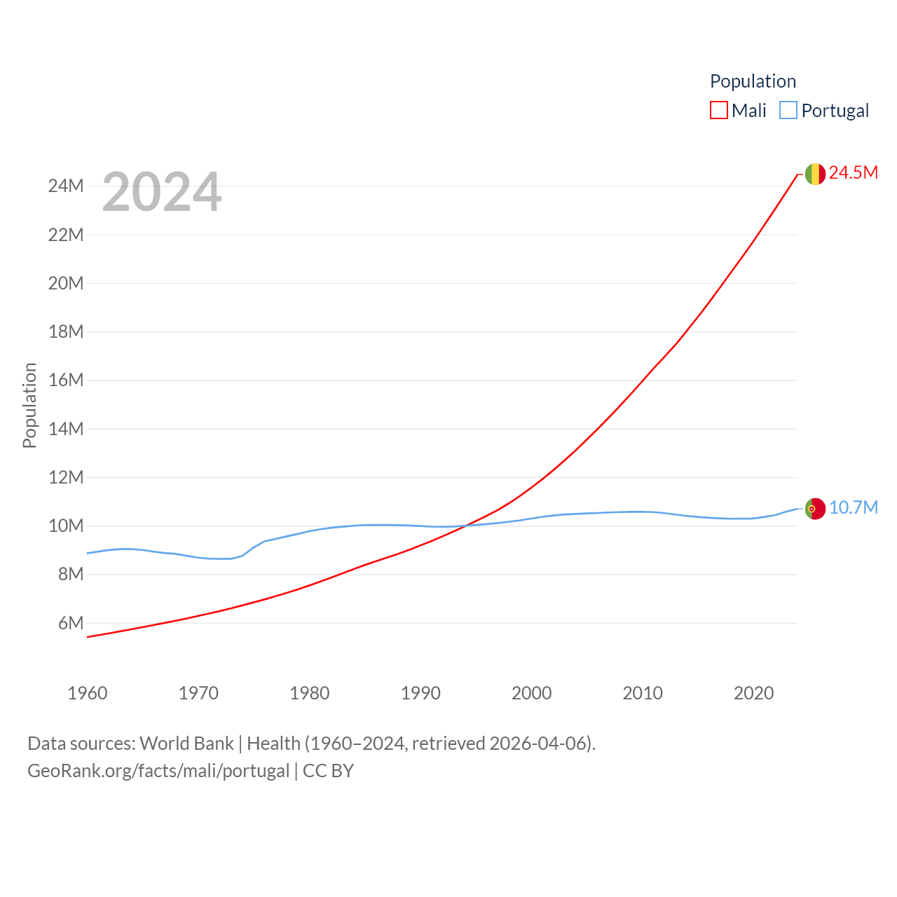 Mali has a population of 24.5M (ranked 58/197), compared with 10.7M in Portugal (ranked 90/197). Mali's land area is 471,118 sq mi versus 35,369 sq mi for Portugal (ranked 23rd vs. 108th).