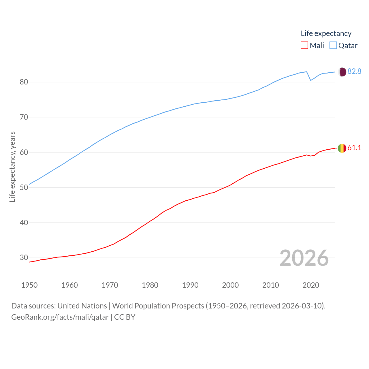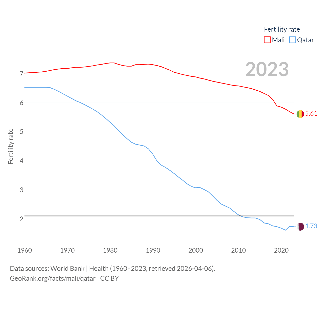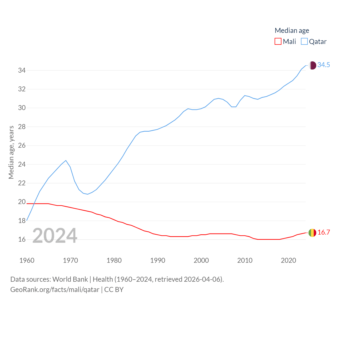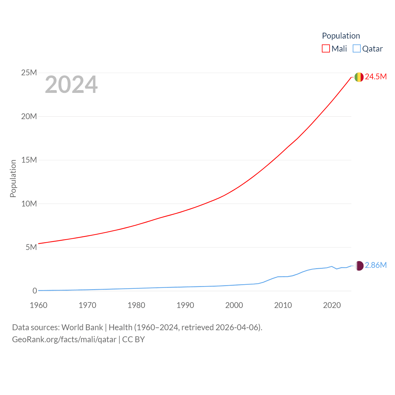 Mali has a population of 24.5M (ranked 58/197), compared with 2.86M in Qatar (ranked 138/197). Mali's land area is 471,118 sq mi versus 4,436 sq mi for Qatar (ranked 23rd vs. 158th).