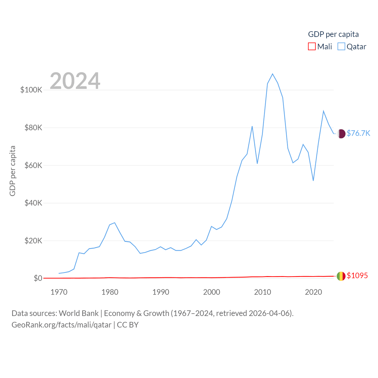 By GDP, Mali ranks 113/197 ($26.8B) and Qatar ranks 56/197 ($219B). By GDP per capita, Mali ranks 173/197 ($1,095), while Qatar ranks 11/197 ($76,689).