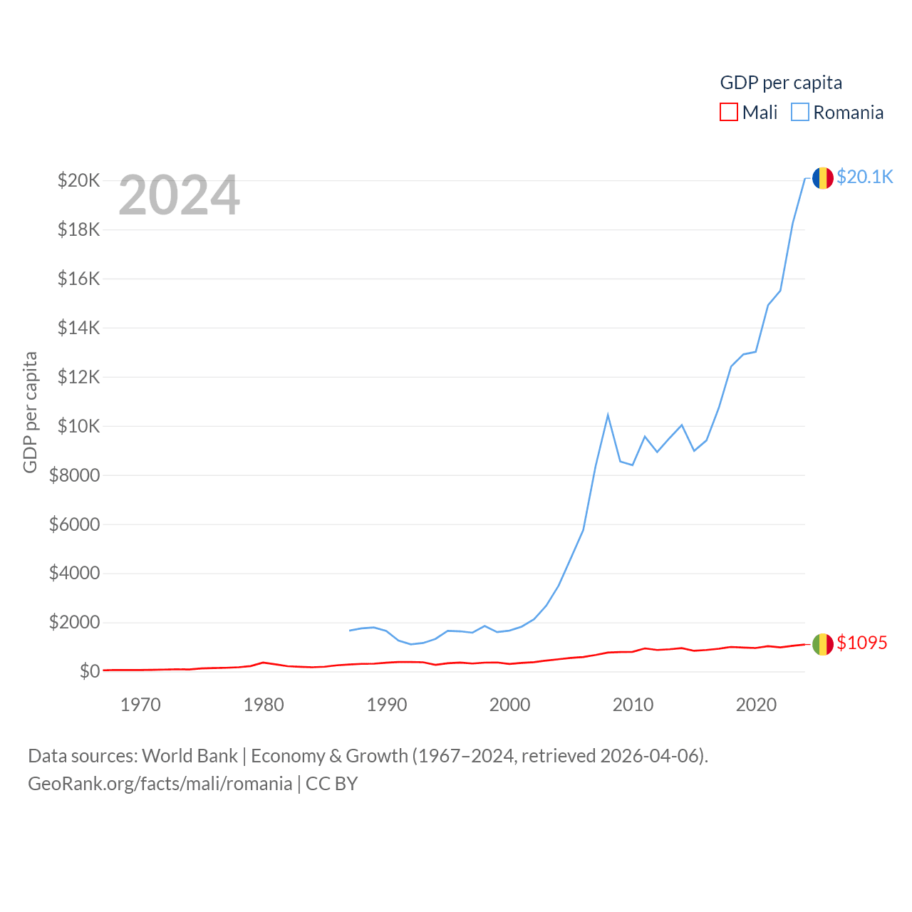 By GDP, Mali ranks 113/197 ($26.8B) and Romania ranks 42/197 ($383B). By GDP per capita, Mali ranks 173/197 ($1,095), while Romania ranks 58/197 ($20,080).