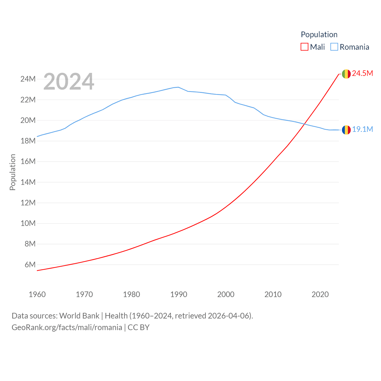 Mali has a population of 24.5M (ranked 58/197), compared with 19.1M in Romania (ranked 67/197). Mali's land area is 471,118 sq mi versus 88,834 sq mi for Romania (ranked 23rd vs. 80th).