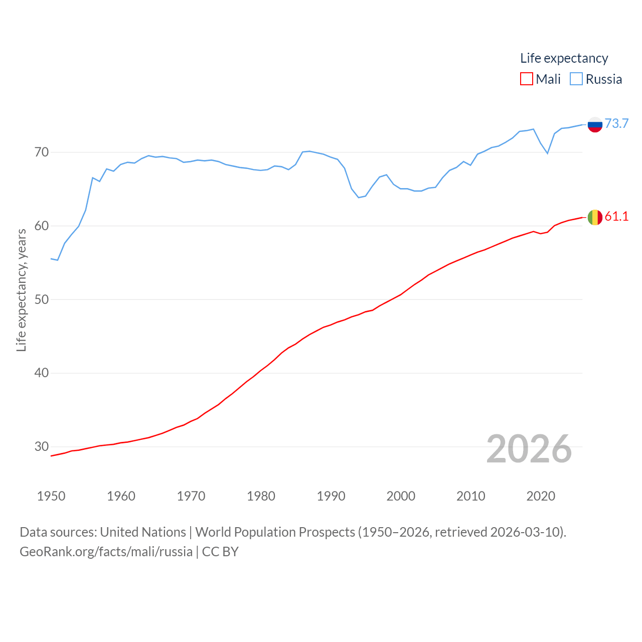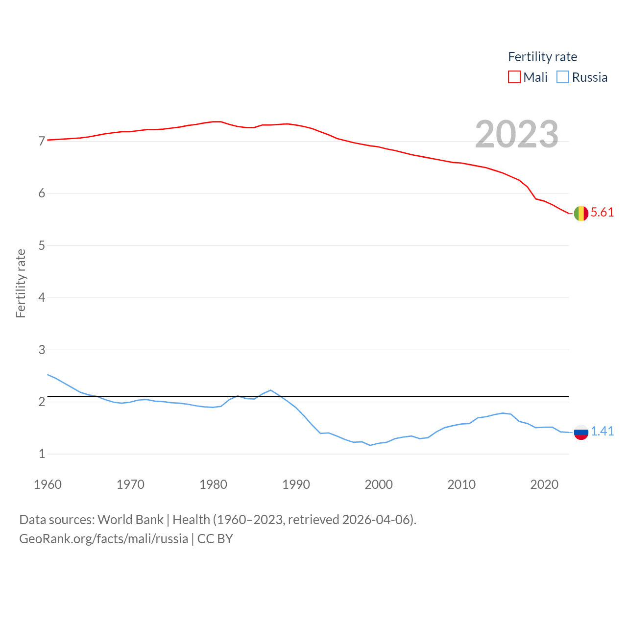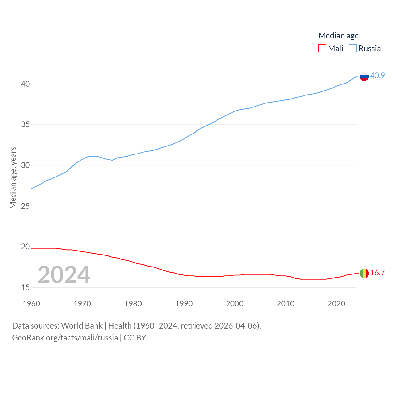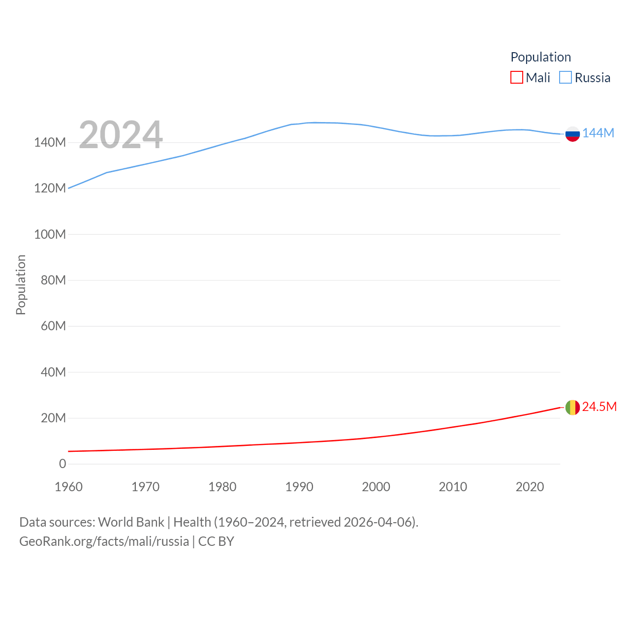 Mali has a population of 24.5M (ranked 58/197), compared with 144M in Russia (ranked 9/197). Mali's land area is 471,118 sq mi versus 6,323,145 sq mi for Russia (ranked 23rd vs. 1st).