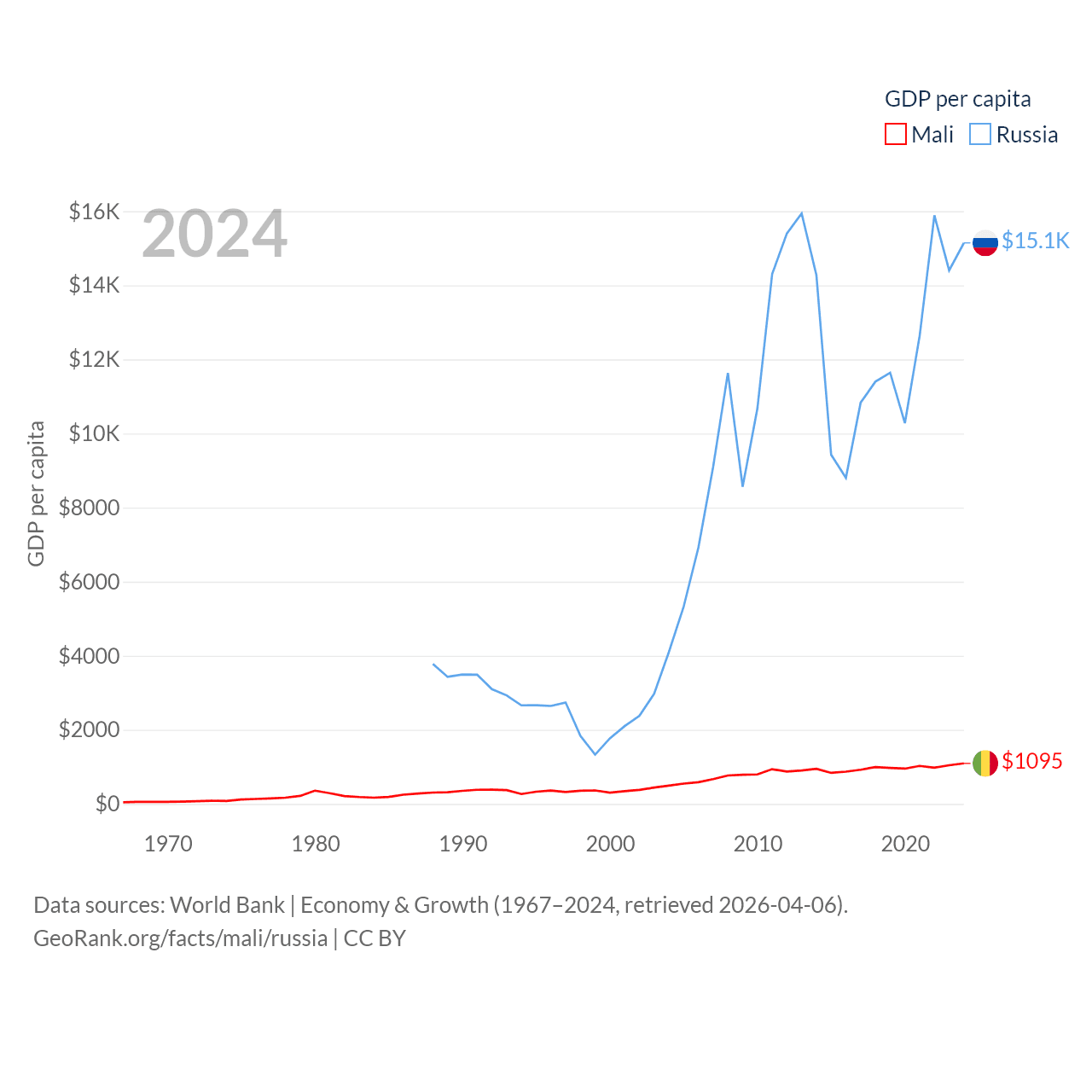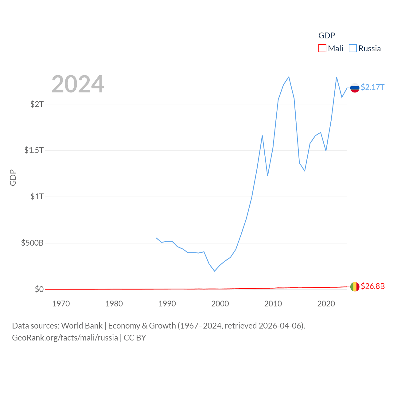 By GDP, Mali ranks 113/197 ($26.8B) and Russia ranks 11/197 ($2.17T). By GDP per capita, Mali ranks 173/197 ($1,095), while Russia ranks 68/197 ($15,145).