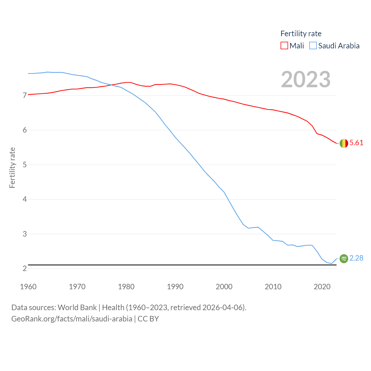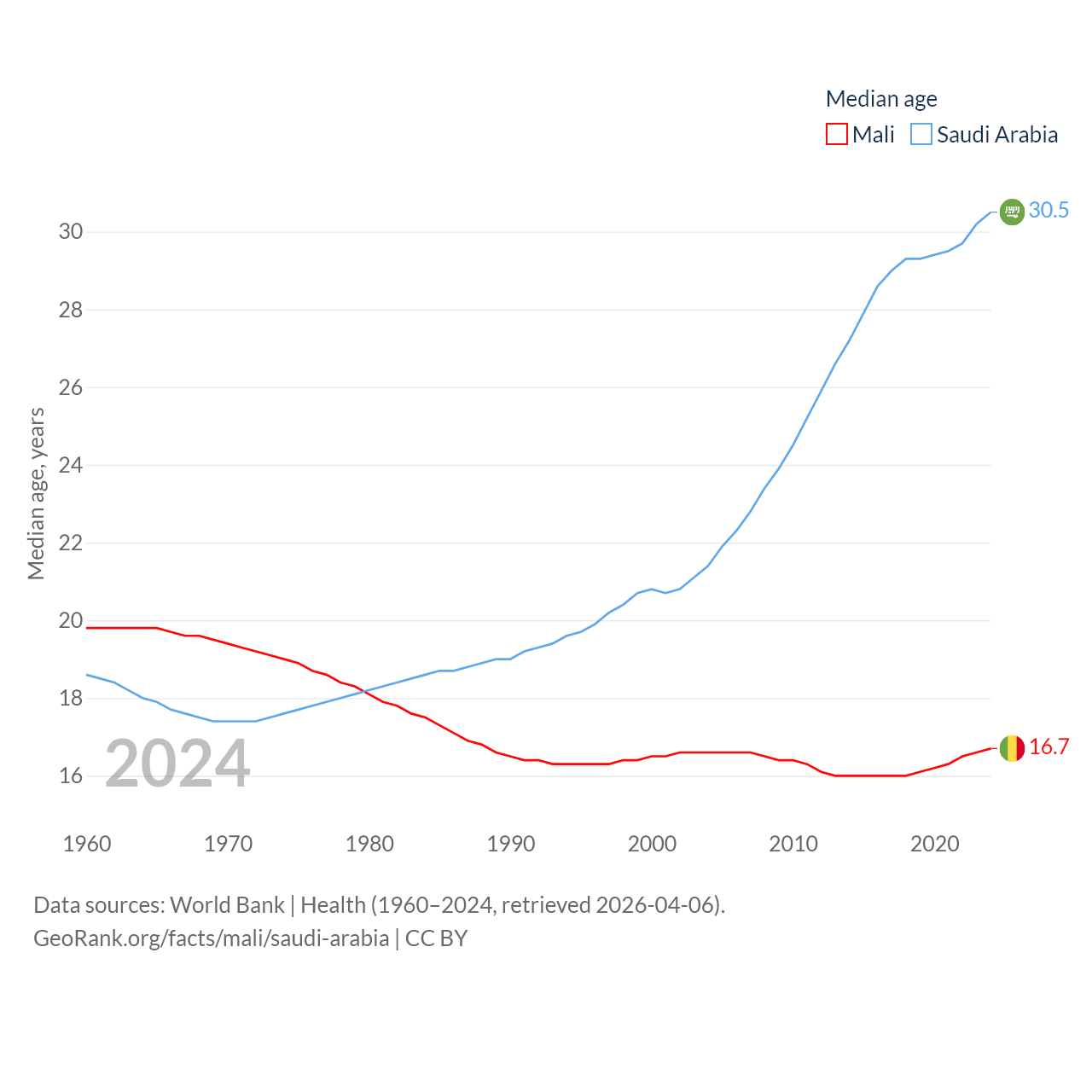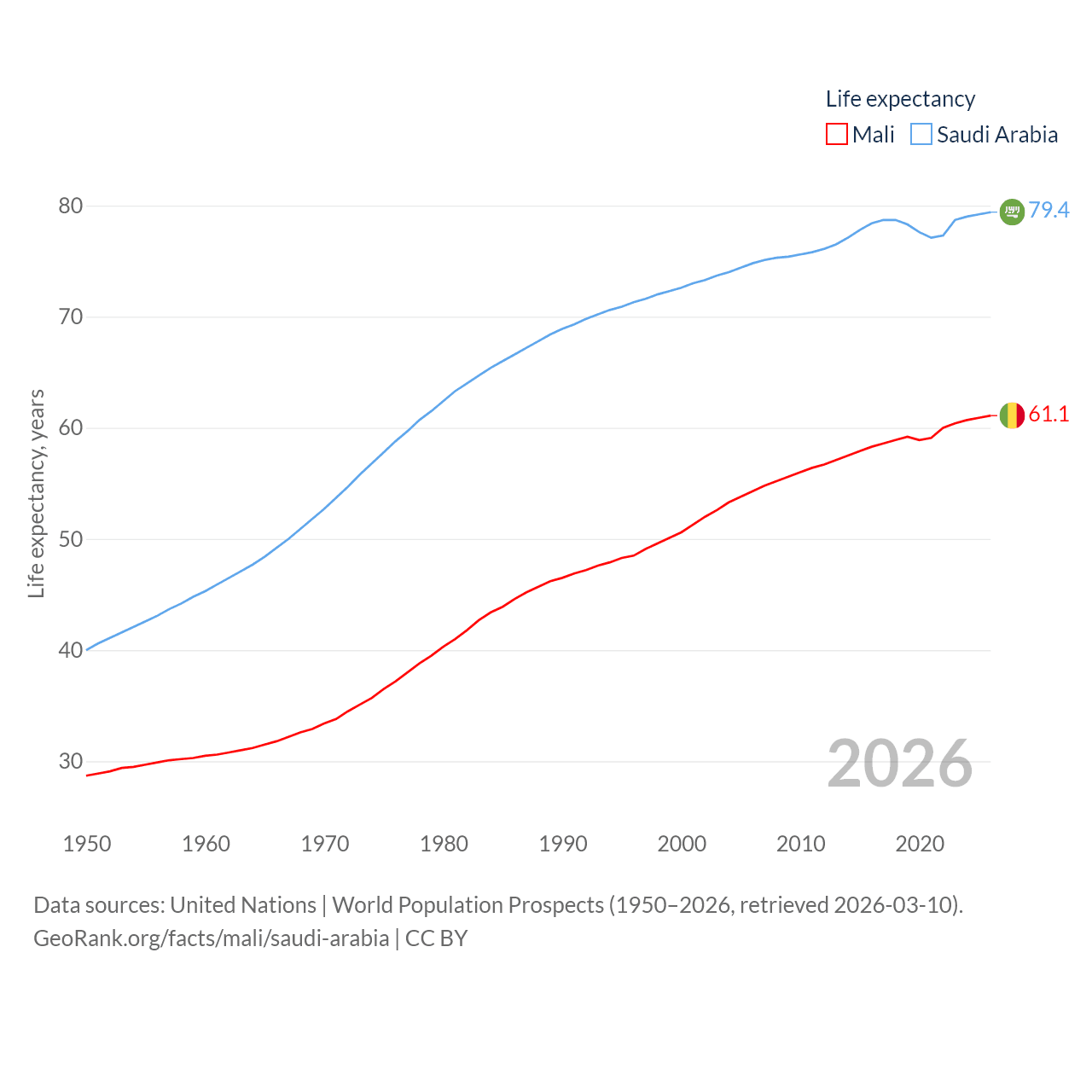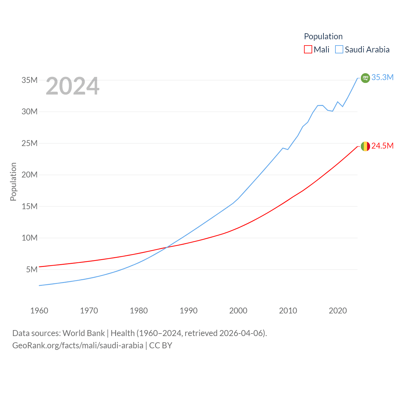 Mali has a population of 24.5M (ranked 58/197), compared with 35.3M in Saudi Arabia (ranked 45/197). Mali's land area is 471,118 sq mi versus 830,000 sq mi for Saudi Arabia (ranked 23rd vs. 12th).